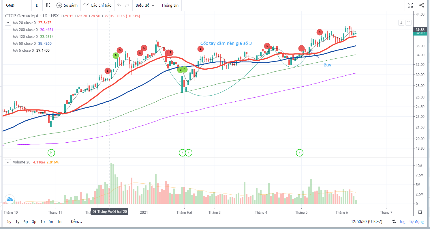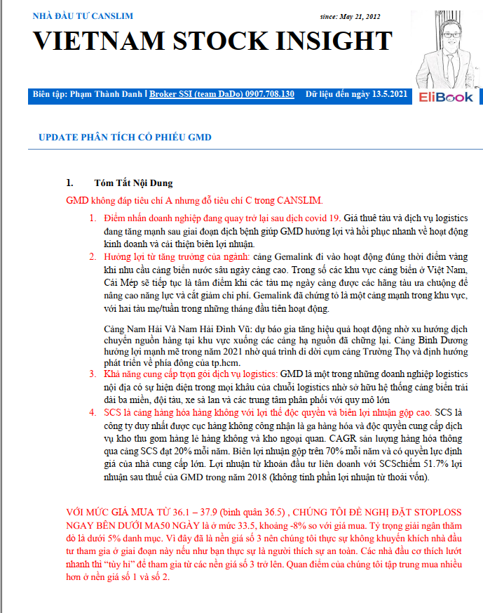 Team Nhà Đầu Tư Canslim (liên hệ zalo 0977.697.420) đã khuyến nghị về GMD vào giữa tháng 5 với lưu ý đây là điểm mua tại nền giá số 3. Hiện tại GMD đã tăng 11% từ điểm mua breakout chiếc cốc tay cầm, giá đang được hỗ trợ bởi MA20 ngày.
