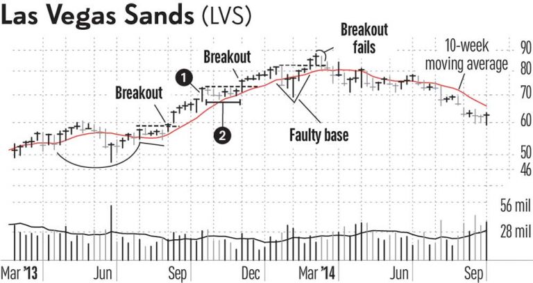 Vào năm 2013, Las Vegas Sands (LVS) có điểm phá vỡ mẫu hình Chiếc Cốc-Tay Cầm với điểm mua 58.21 trong tuần kết thúc ngày 16 tháng 9. Trong hơn 7 tuần, nó đã tăng 26%, một thời điểm tốt để chốt lãi (điểm số 1).