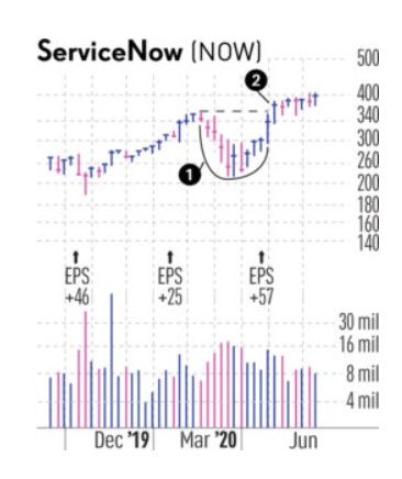 Cổ phiếu ServiceNow (NOW), ví dụ. Giống như hầu hết các cổ phiếu khác, ServiceNow rớt sâu trong cú sụp đổ virus Corona. Sau khi chạm đáy thấp vào tuần kết thúc tháng 3 năm 2020, nó bắt đầu tăng để hình thành phái bên phải của Mẫu Hình Cốc (Điểm số 1) với 4 tuần tăng giá liên tiếp.