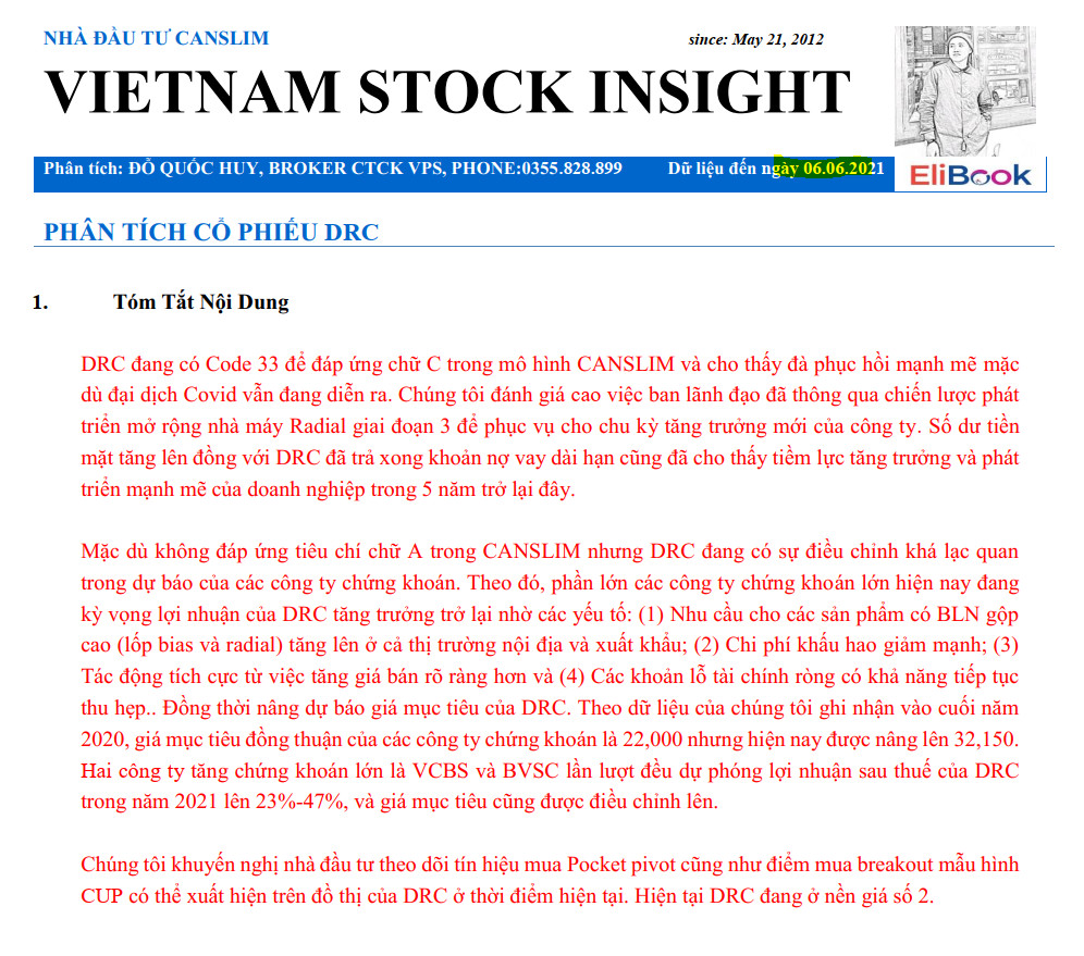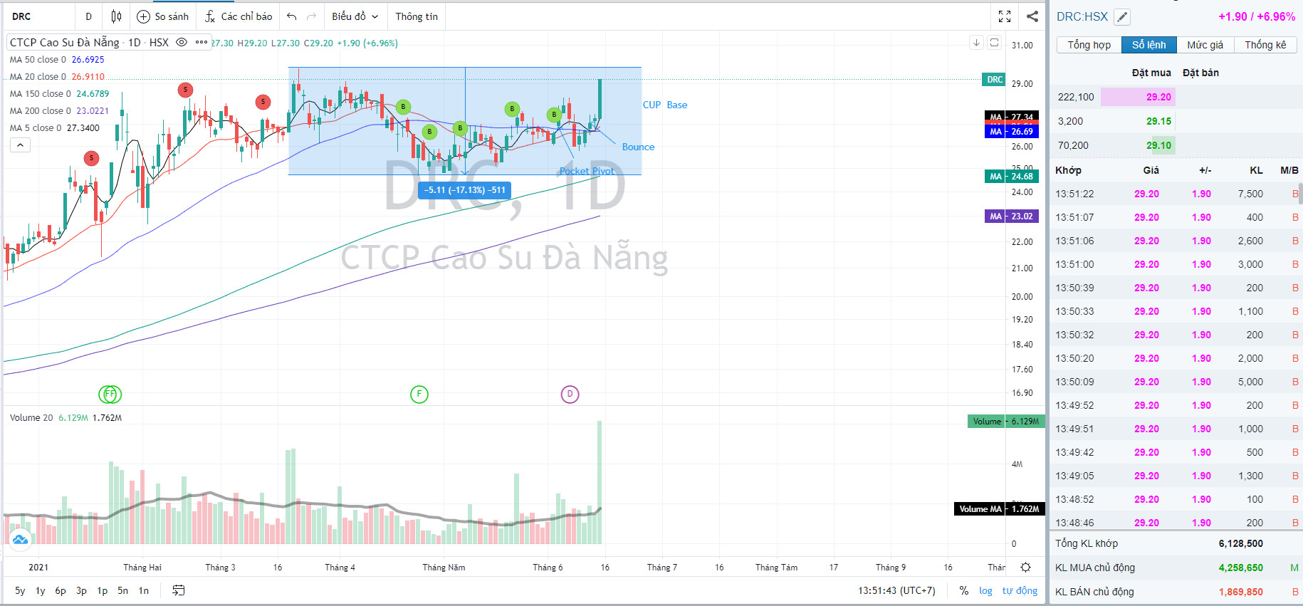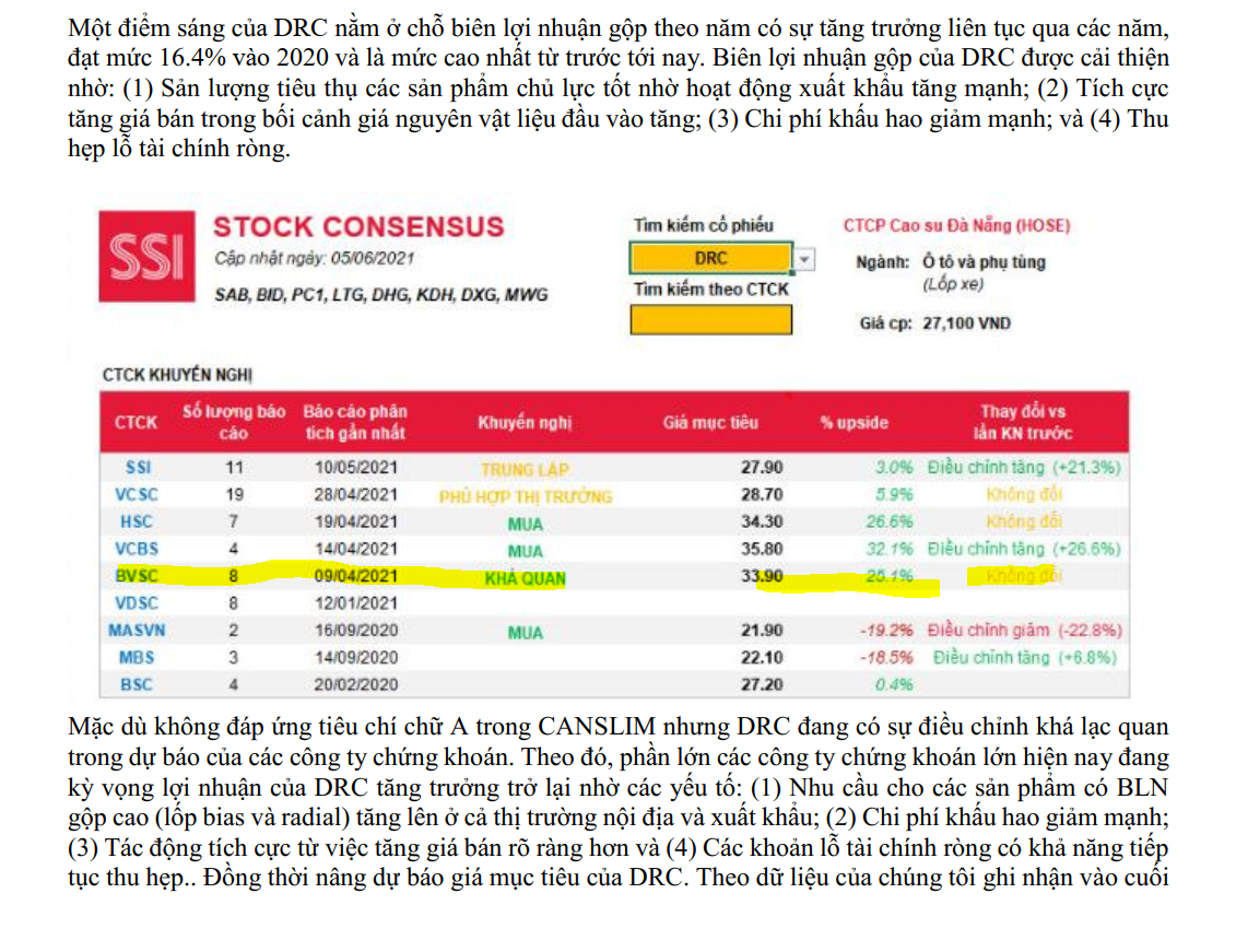 DRC tăng trần và tiến sát điểm pivot 29.7 của mẫu hình CUP. Việc CTCK BVSC nâng triển vọng dự báo từ 33,900 (báo cáo ngày 9/4/2021) lên 36,500 tại thời điểm hiện nay tạo nên chất xúc tác triển vọng giá theo cách giao dịch của phù thủy chứng khoán Mark Minervini. Trong báo cáo ngày 6.6.2021 của Team Nhà Đầu Tư CANSLIM (Zalo 0977.697.420) về cổ phiếu DRC, chúng tôi đã trích dẫn dữ liệu Stock Consensus của SSI cho thấy trước đó một số công ty chứng khoán đã nâng triển vọng dự báo về DRC.