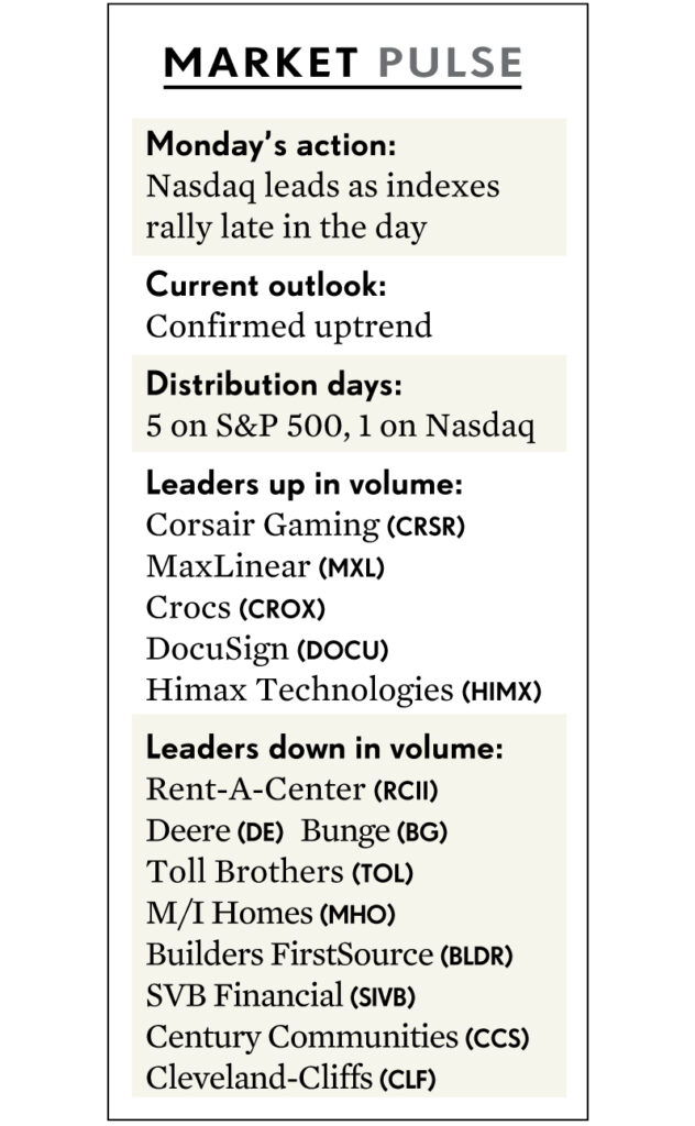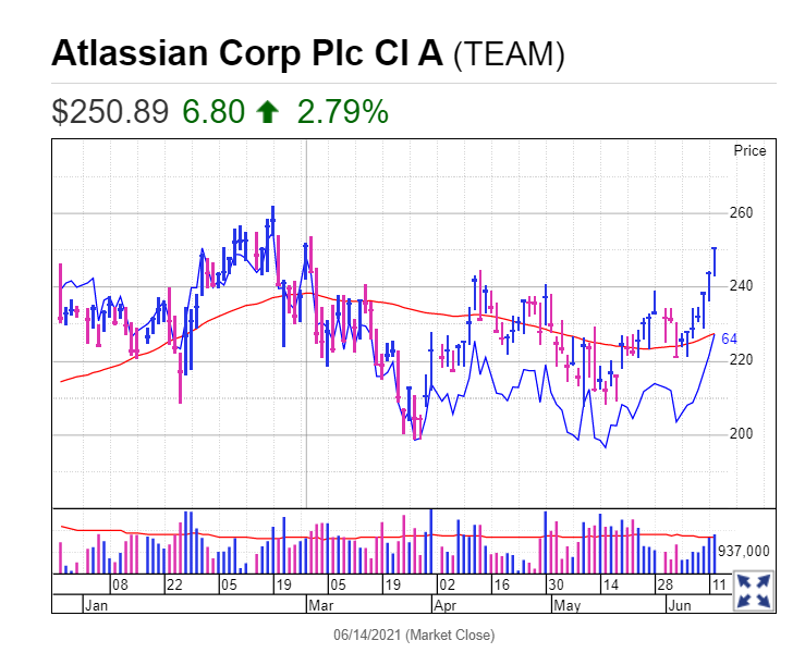 Vào ngày thứ hai, gã sản xuất ủng Crocs (CROX) tăng vượt qua điểm mua Nền Giá Phẳng (Flat Base) và được bổ sung vào danh sách IBD LeaderBoard. Cổ phiếu dẫn dắt phần mềm đám mây Atlassian (TEAM) định hình rõ mẫu hình trong 8 tuần, trong khi cổ phiếu tương đồng trong ngành là Dynatrace (DT) tăng vượt qua điểm mua 56.23, mặc dù với khối lượng thấp. Dynatrace được đề cập đến trong chương trình IBD Live Show của ngày thứ hai.
