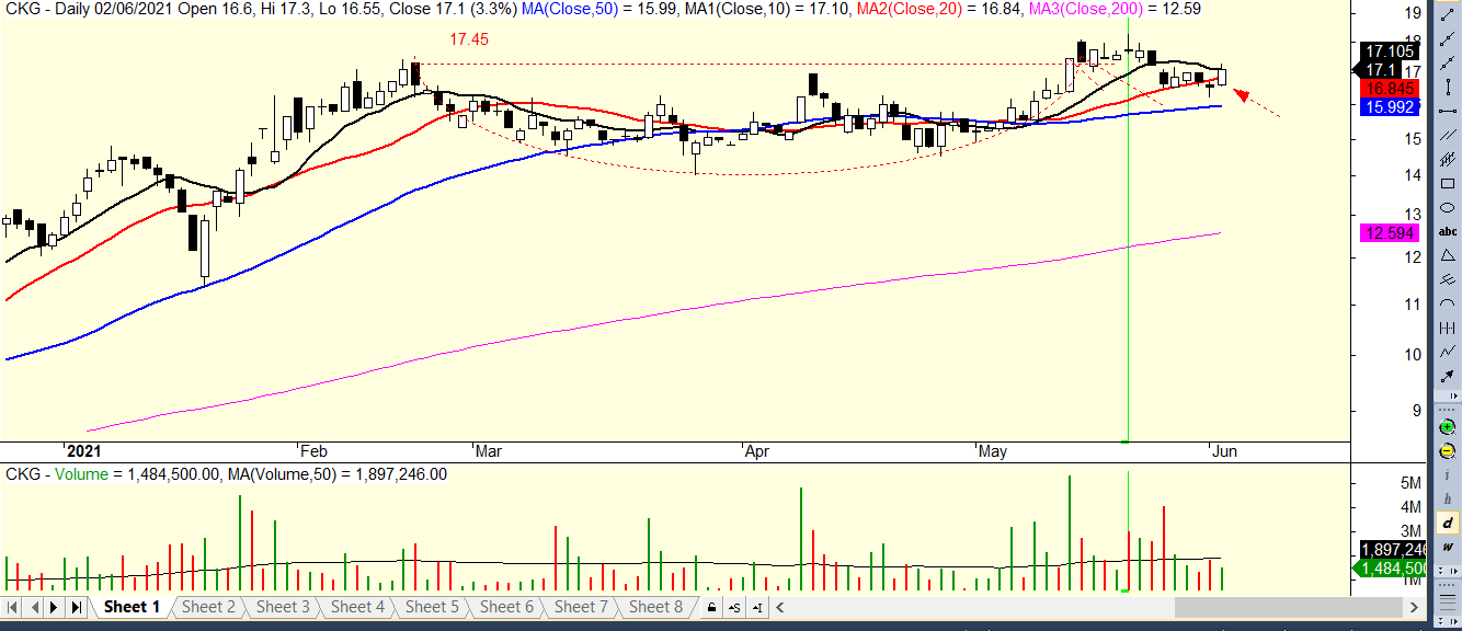 Theo mô hình giao dịch CANSLIM, cổ phiếu CKG xuất hiện điểm mua Pocket pivot trùng với điểm mua Pull back MA50 ngày trong ngày 16/6/2021. Chúng tôi thực hiện chiến lược mở mua thăm dò với tỷ trọng 5% NAV sau khi đã cắt lỗ cổ phiếu này ở điểm mua trước đó. Mẫu hình mà chúng tôi đang theo dõi là Kênh giá song song nằm chồng lên Cốc. Chú ý: hiện tại CKG đang ở nền giá số 2.