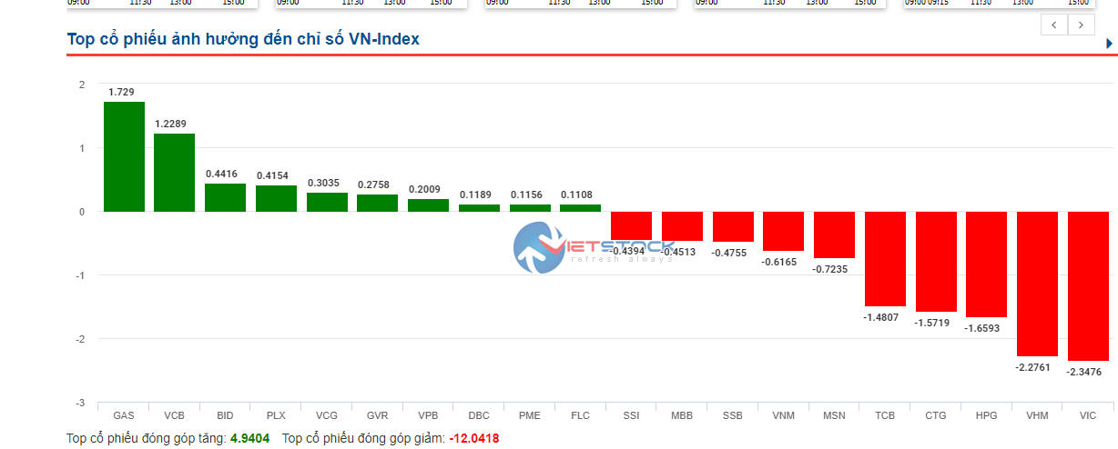 Chỉ số VN-Index giảm 0.8% với thanh khoản hôm nay đạt 740 triệu đơn vị, cao hơn so với phiên trước. Thị trường hôm nay tăng giá khá tích cực từ đầu phiên giao dịch nhưng cuối phiên áp lực bán đổ ra từ các cổ phiếu Blue Chips khiến thị trường chung xuất hiện thêm phiên phân phối thứ hai. Tội đồ trong ngày hôm nay chính là những cổ phiếu dẫn dắt xu hướng thị trường tăng giá trong suốt thời gian vừa qua như HPG (-2.6%), CTG (-3.1%), TCB (-3.1%), MBB (-1,5%), SSI (-5%), VHM (-2.3%),.. Tuy nhiên những cổ phiếu này có ngày giảm giá với khối lượng thấp nên chưa có gì đáng lo ngại. Dẫn dắt nhóm cổ phiếu tăng giá trong ngày hôm nay phải kể đến là nhóm cổ phiếu của họ dầu khí như GAS (+3.6%), PLX (+2.2%), BSR (+5%),…. Xoay tua đổi trụ là điều mà chúng tôi quan sát thấy ở thời điểm hiện tại của thị trường.