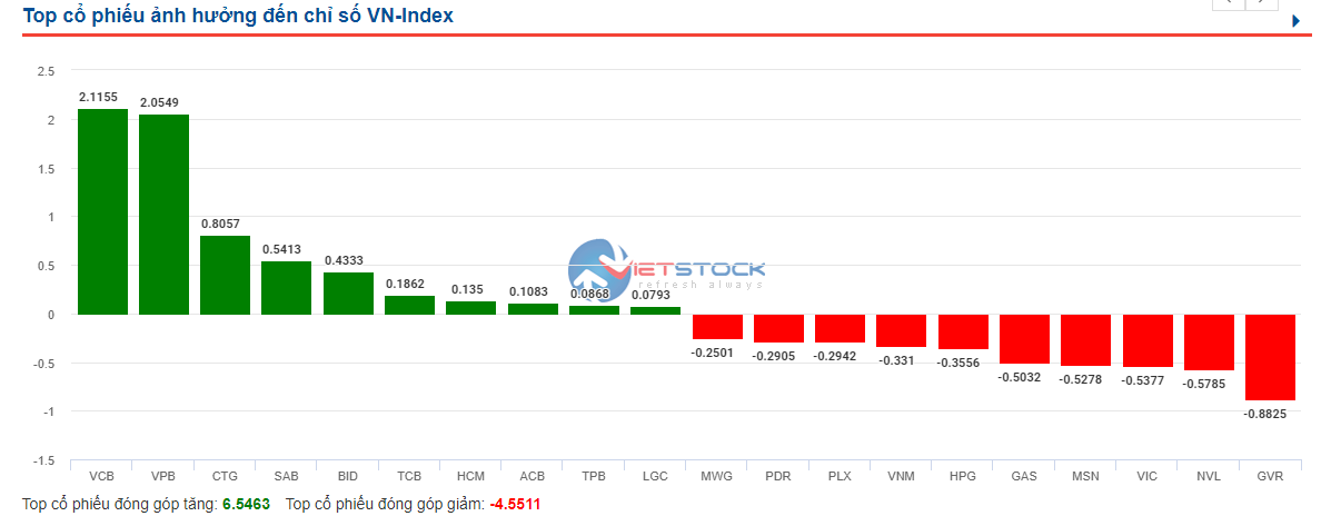 Chỉ số VN-Index giảm 0.2% với thanh khoản hôm nay đạt 674 triệu đơn vị, thấp hơn so với phiên trước. Thị trường giao dịch với biên độ hẹp trong 3 phiên giao dịch gần nhất cho thấy sự lưỡng lự của dòng tiền ở thời điểm hiện tại. Thị trường hôm nay mở tăng giá nhưng cuối cùng lại quay đầu giảm giá cuối phiên với sự góp mặt của dàn cổ phiếu đã làm mưa làm gió ở giai đoạn trước đó như GVR(-0.4%), NVL (-1.33%), VIC (-0.5%), MSN (-1.6%), GAS (-1.1%), HPG (-0.6%)… Hôm nay, nhóm cổ phiếu ngân hàng có ngày tăng điểm nâng đỡ cho đà giảm giá của thị trường tiêu biểu như VCB (+1.94), VPB (+4.5%), CTG (+1.5%),…