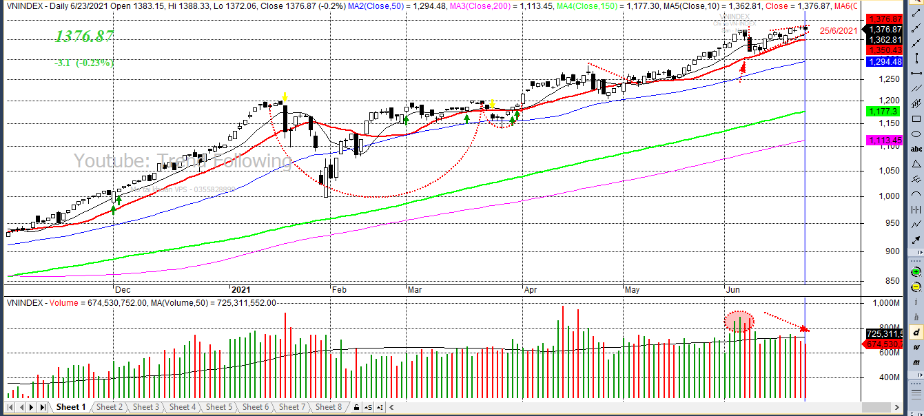 Chỉ số VN-INdex hôm nay giao dịch với biên độ hẹp cùng với khối lượng thấp cho thấy hành động giá lưỡng lự cũng như yếu ớt của thị trường chung hiện tại. Sự suy yếu đến từ các nhóm ngành dẫn dắt trước đó như ngân hàng, chứng khoán, thép vẫn chưa tiếp tục phá định làm dấy lên nghi ngờ về đà tăng giá của thị trường cho giai đoạn tới khi mà ngày đảo chiều chiêm tinh đang thực sự ở rất gần với chúng ta. Xu hướng tăng giá của thị trường vẫn đang được xác nhận với 1 phiên phân phối còn hiệu lực. Phiên phân phối ngày 8/6/2021 đã bị xóa bỏ theo quy tắc 5%, khi thị trường hôm nay đạt mốc 1388 điểm ngay trong phiên giao dịch.