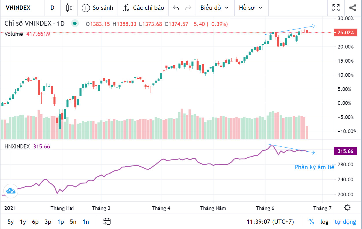 Chúng tôi quan sát thấy đang có phân kỳ liên thị trường giữa chỉ số VN-Index và HNX-Index (một công cụ xác định đỉnh khác của William O’Neil)