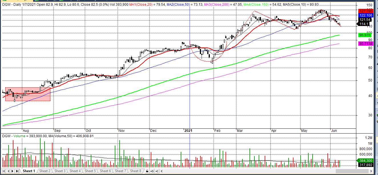 Bên cạnh việc quan sát hành động của thị trường chung, chúng tôi còn quan sát đến sức khỏe của các cổ phiếu thuộc nhiều nhóm ngành dẫn dắt khác nhau. Chúng tôi đang quan sát kịch bản một số cổ phiếu dẫn dắt đang có khuynh hướng tạo lập đỉnh trước thị trường chung. Cổ phiếu mà chúng tôi muốn nhắc đến là DGW. Cổ phiếu này thuộc dòng cổ phiếu dẫn dắt trong xu hướng tăng giá trước đó của thị trường, cổ phiếu từ đáy tháng 4/2020 đến bây giờ đang tăng giá 750% và trải qua 3 nền giá. Hiện tại cổ phiếu đang ở nền giá số 4, mẫu hình đảo chiều xu hướng tăng mà chúng tôi đang quan sát có thể xảy ra với cổ phiếu này là mẫu hình Vai đầu vai kinh điển. Sự xác nhận của mẫu hình khi cổ phiếu phá vỡ đường neckline đi kèm khối lượng lớn.