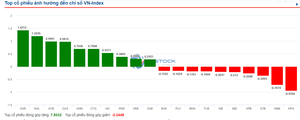 Chỉ số VN-INdex hôm nay tăng 0.2% đi kèm sự mất hút về thanh khoản, khối lượng giao dịch đạt 537 triệu cổ phiếu, thấp hơn phiên hôm trước. Tiêu điểm trong ngày giao dịch hôm nay phải nói đến lỗi hệ thống khi đầu phiên một số mã cổ phiếu đều đột ngột tăng trần trong phiên ATO nhưng sau đó thì chuyện cũng đâu vào đó khi hệ thống được fix lỗi ngay lập tức. Thị trường dạo gần đây giao dịch với phong cách khá từ tốn và chậm rãi khiến cho nhiều nhà đầu tư có thể gọi là “ngủ gật” trong phiên giao dịch. Trở lại với ngày tăng giá yếu ớt này không thể không nhắc đến nhiều cái tên trong nhóm ngân hàng khá đỗi quen thuộc là VCB (+0.9%), ACB (+1.1%), CTG (+1.3%),… cùng với một số cổ phiếu có vốn hóa lớn như GVR (+3.9%), NVL (+2.7%), VHM (+0.7%),…Bên phia chiến tuyến HPG, VNM, STB, VPB, BID,.. là những cổ phiếu có ngày giảm giá thuộc nhóm ảnh hưởng trực tiếp đến thị trường chung.