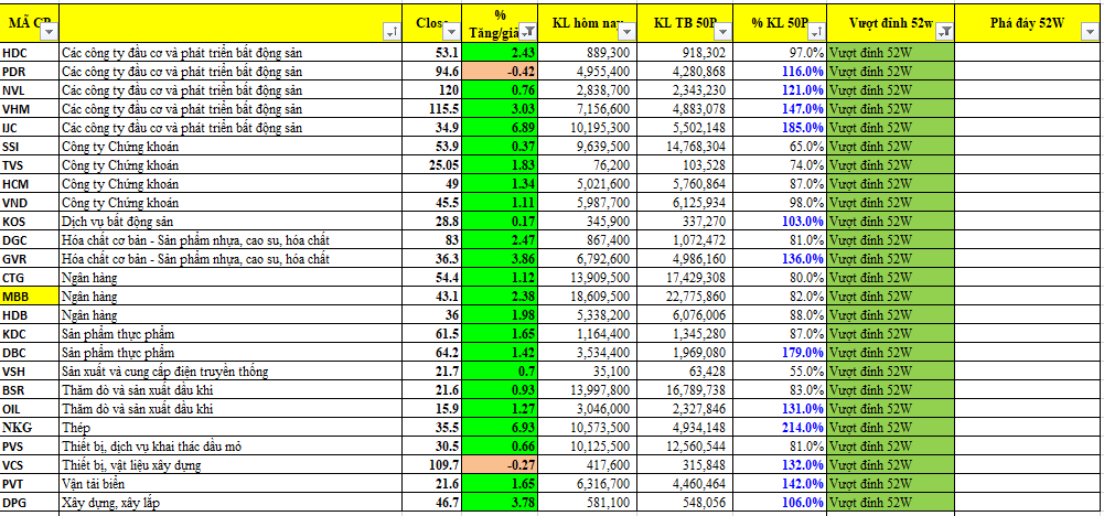 Danh sách cổ phiếu vượt đỉnh 52 tuần thu hẹp và chỉ tập trung ở một số cổ phiếu của các nhóm ngành: Bất động sản, khu công nghiệp hạ tầng bất động sản, ngân hàng là chủ yếu. Còn những nhóm ngành như: Vận tải – cảng biển, thép… bùng nổ nhưng khối lượng không bùng nổ cho thấy dòng tiền không bùng nổ cả nhóm ngành mà chỉ tập trung ở một số của phiếu.