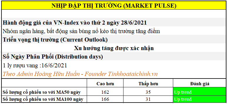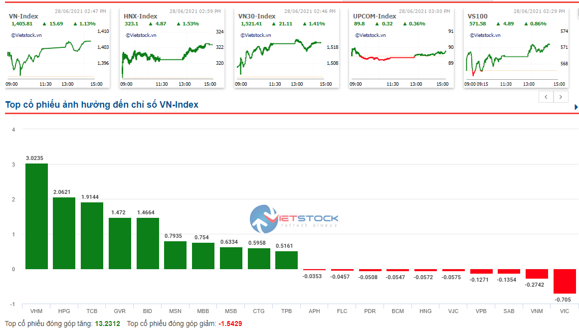 Kết thúc phiên giao dịch ngày 28/6/2021 chỉ số VNIndex đóng cửa ở mức 1,405.81 điểm, tăng 15.69 điểm, tương ứng tăng 1.13%. Thanh khoản thị trường đạt hơn 654 triệu đơn vị và cao hơn phiên ngày  25/6/2021, nhóm ngành ngân hàng, bất động sản bùng nổ kéo thị trường tăng điểm mạnh. Trong đó vai trò của nhóm ngành ngân hàng thấy rõ khi nhóm này bùng nổ mạnh như: TCB,HDB,MBB,MSB… đã giúp thị trường tăng điểm. Nhóm ngành bất động sản, khu công nghiệp hạ tầng bất động sản vẫn song tấu cùng nhóm ngành ngân hàng với các cái tên: PDR,NVL,VHM,GVR,KBC,IJC… cũng góp phần vào đà tăng của thị trường phiên hôm nay. Những cổ phiếu trái ngược xu hướng tăng vẫn tiếp tục xu hướng giảm như: VNM,SAB,VJC,VIC... đã kiềm hãm đà tăng của thị trường, tuy nhiên mức độ ảnh hưởng đến thị trường hiện tại ở mức thấp.