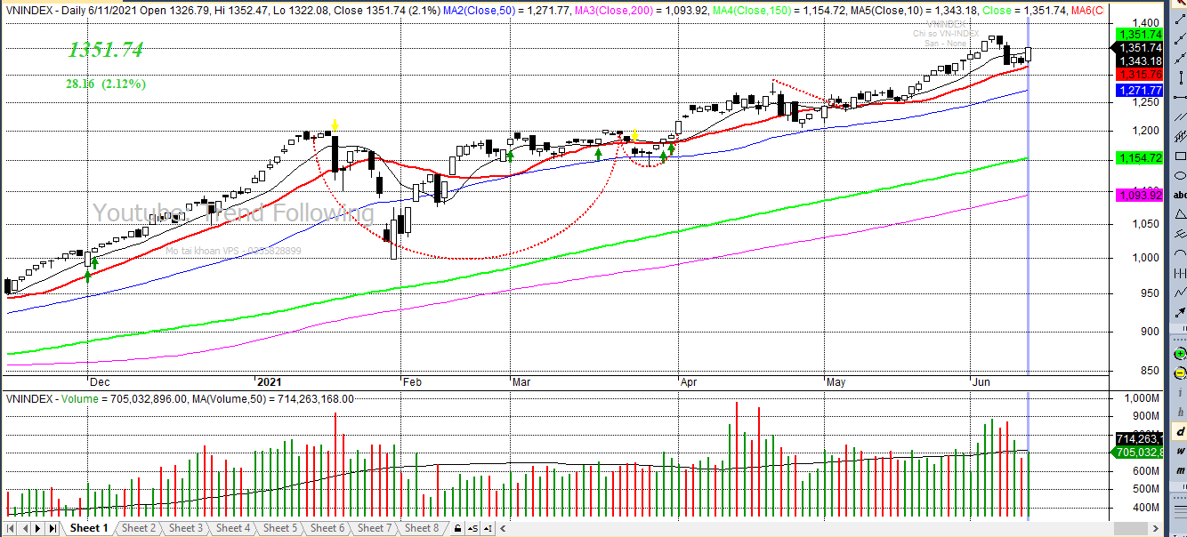 Về hành động giá và khối lượng của phiên ngày 28/6/2021 được đánh giá là tích cực khi giá của chỉ số VNIndex tiếp tục thiết lập đỉnh giá mới. Kênh giá trên của chỉ số VNindex đang hướng về vùng 1450 điểm. Nhóm ngành ngân hàng, chứng khoán, bất động sản, khu công nghiệp hạ tầng bất động sản tiếp tục bùng nổ giúp xu hướng tăng của chỉ số VNIndex được củng cố. Trong đó vai trò của nhóm ngành ngân hàng không thể phủ nhận trong xu hướng tăng của thị trường. Với đà tăng của thị trường hiện tại có thể dùng MA10 ngày để làm mức dừng lỗ, tương ứng với vùng 1376 điểm.