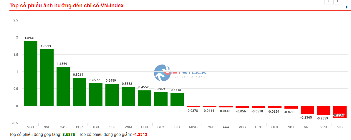 Chỉ số VN-Index tăng 0.8% với thanh khoản hôm nay đạt 518 triệu đơn vị, thấp hơn so với phiên trước. Khối lượng tại vùng đỉnh mới của chỉ số đang dần mất hút, liệu thị trường sẽ tăng tiếp tục hay sụp đổ tại ngưỡng cửa thiên đường? Đây là câu hỏi được rất nhiều nhà đầu tư đặt ra tại thời điểm bấy giờ khi thị trường đã trải qua 1 năm 3 tháng tăng giá kể từ đáy tháng 4/2020. Thị trường hôm nay giao dịch khá tĩnh lặng vào đầu phiên nhưng sau đó tăng giá vào cuối phiên với sự góp mặt của nhiều gương mặt nổi trội như VCB (+1.7%), NVL (+3.6%), GAS (+2.3%), PDR (+6.7%), TCB (+1.4%), SSI (+6.97%)… Thị trường trong một ngày nỗ lực tăng giá của một nhóm nhỏ cổ phiếu vốn hóa lớn thuộc rổ VN30 đã đẩy thị trường lên một nấc thang mới trong khi nhóm ngành thép, ngân hàng ngoài trừ VCB lại đang cho thấy điều ngược lại.