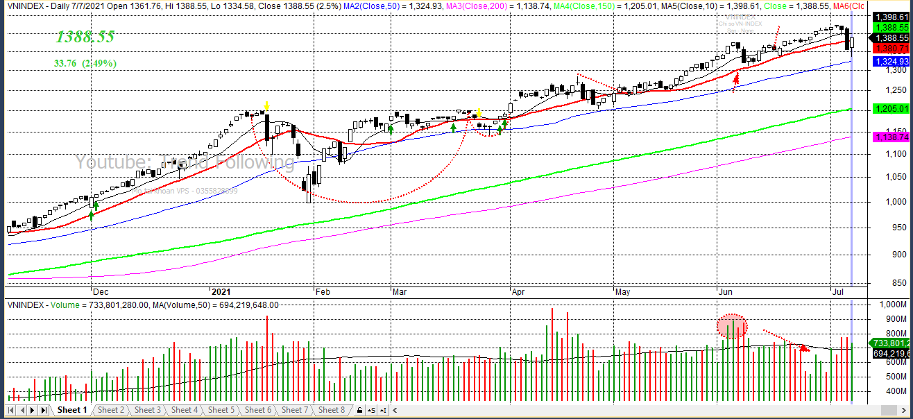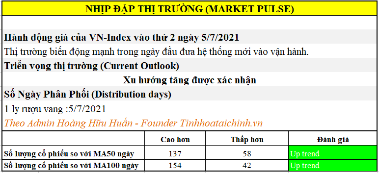 Xu hướng thị trường đang ở “Xu hướng tăng được xác nhận” với 1 phiên phân phối ngày 5/7/2021. Nhóm ngành ngân hàng, chứng khoán, bán lẽ , cảng biển – logistics vẫn là tâm điểm của dòng tiền trong đó sự dẫn dắt của nhóm ngành ngân hàng là không thể phủ nhận. Phiên hôm nay thị trường giằng co khá mạnh giữa bên mua và bên bán, nhưng lực mua khá mạnh đã làm thị trường bớt giảm điểm vào phiên chiều. Sau phiên hôm nay số lượng cổ phiếu trên bình quân 50 phiên vẫn đang chiếm áp đảo số lượng cổ phiếu dưới bình quân 50 phiên cho thấy xu hướng tăng của thị trường vẫn đang được củng cố.