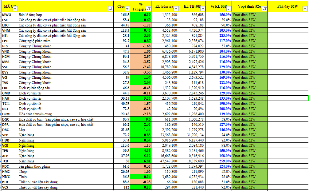 Danh sách cổ phiếu vượt đỉnh 52 tuần mở rộng so với phiên ngày 2/7/2021 chủ yếu tập trung ở các cổ phiếu nhóm ngành: Ngân hàng, chứng khoán, bất động sản, bán lẽ, cảng biển – logistics là chủ yếu.