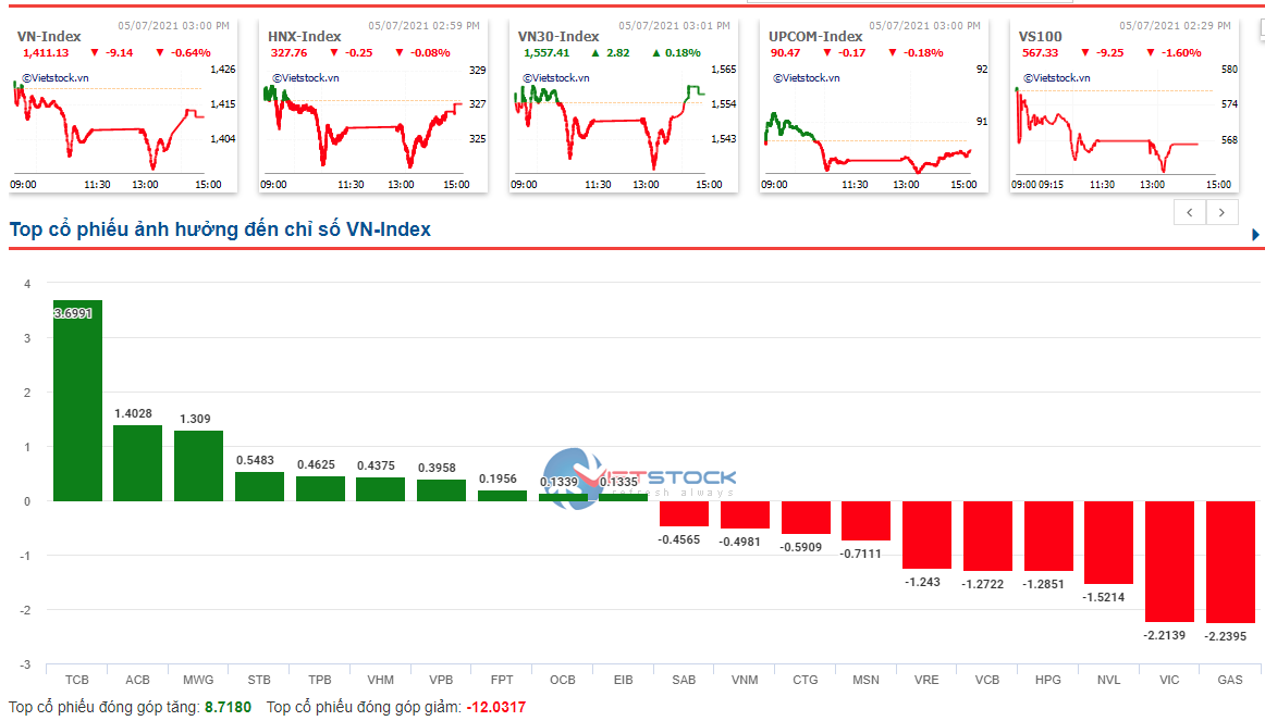 Kết thúc phiên giao dịch ngày 5/7/2021 chỉ số VNIndex đóng cửa ở mức 1,411.13 điểm, giảm 9.14 điểm tương ứng giảm 0.64%. Thanh khoản thị trường đạt hơn 774 triệu đơn vị và cao hơn phiên ngày 2/7/2021 trong ngày đầu tiên đưa hệ thống mới của FPT vào việc vận hành, thanh khoản được cải thiện rõ rệt. Nhóm ngành ngân hàng, chứng khoán, bất động sản vẫn đang là tâm điểm của thị trường trong đó tâm điểm là cổ phiếu TCB khi đóng góp 3.6 điểm vào đà tăng của thị trường, tiếp theo là các cổ phiếu ngành ngân hàng như: ACB, STB,TPB, VPB, OCB cũng tăng điểm kéo thị trường hồi phục. Còn nhóm ngành kéo thị trường giảm điểm mạnh có các cổ phiếu nhóm ngành dầu khí, bất động sản như: GAS, NVL,VRE…. Độ biến động của thị rường tăng mạnh với cảm giác từ bờ đến vực sâu và xíu chút nữa là về bờ.