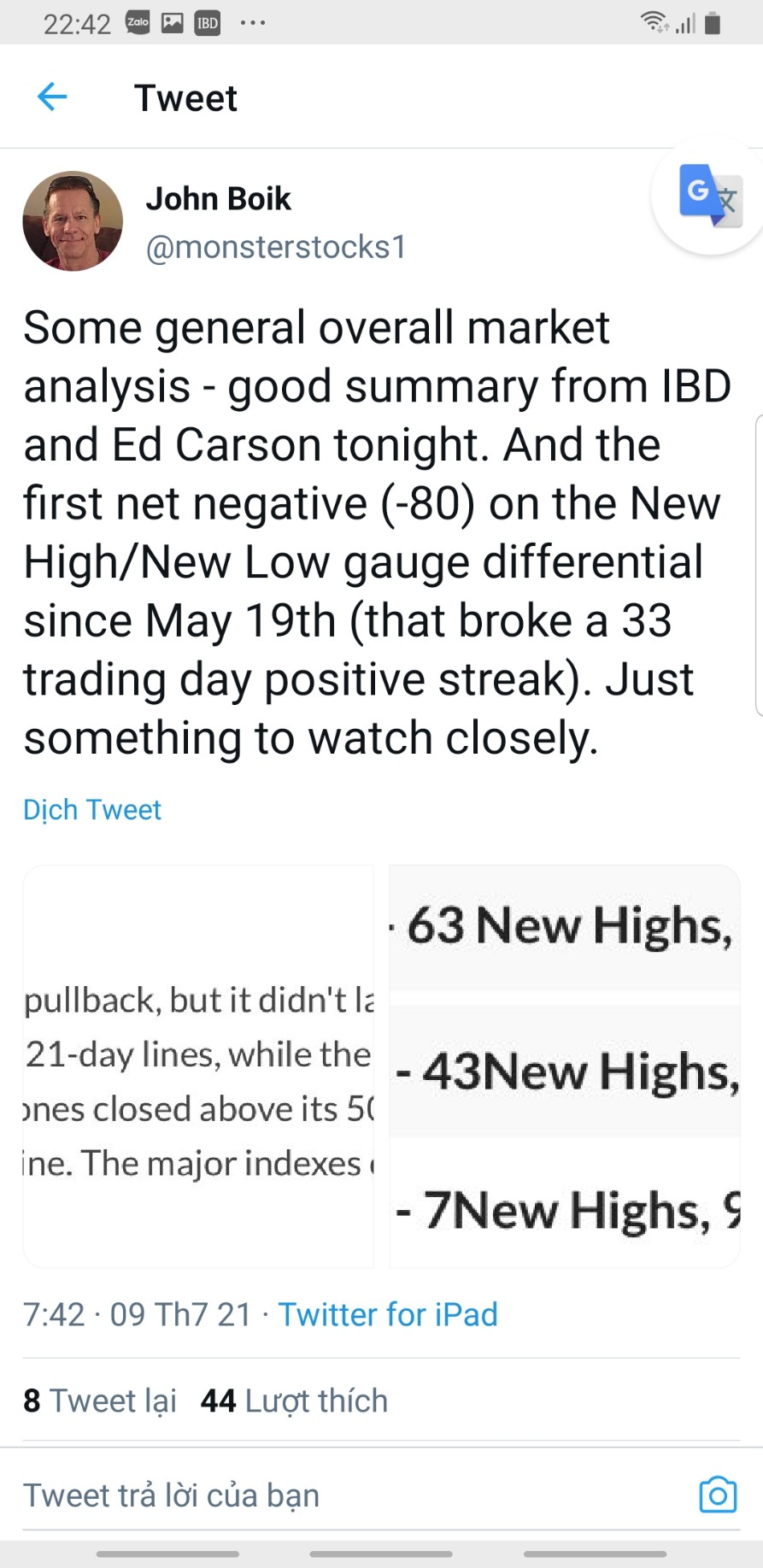 Chỉ số SP500 có một ngày phân phối vào phiên ngày thứ năm, nhưng cú tăng giá từ đáy ngày thứ năm ở các chỉ số thị trường và tiếp tục tăng mạnh trong phiên ngày thứ sáu cho thấy người mua vẫn còn. Xu hướng tăng hiện vẫn còn duy trì. Chỉ số Nasdaq chỉ mới có 2 ngày phân phối. Trong đó là một ngày phân phối nhẹ vào phiên ngày thứ tư. Ngày phân phối còn lại là 15/6/2021 khi chỉ số này giảm 0.7% với khối lượng cao hơn (vẫn là mức phân phối nhẹ).