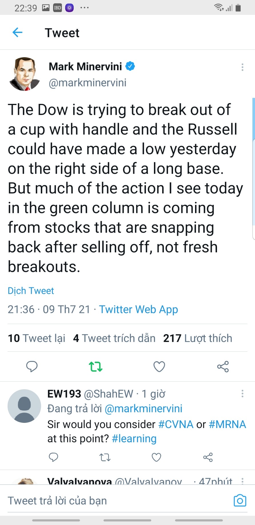 Theo dõi bình luận của Phù Thủy Mark Minervini trên mạng xã hôi Twitter, tôi nhận thấy Mark đang thận trọng với thị trường. Mark nói: “Chỉ số DJIA đang cố gắng tạo điểm phá vỡ từ mẫu hình chiếc cốc tay cầm và chỉ số Russell cũng đã tạo đáy trong phiên ngày thứ năm, ở phía bên phải của một nền giá kéo dài. Nhưng nhiều hành động mà tôi thấy ngày hôm nay ở các cổ phiếu tăng giá là các cổ phiếu này đang chỉ hooifleen sau khi bị bán tháo, đây không phải là điểm phá vỡ (breakout) ngon ăn.”