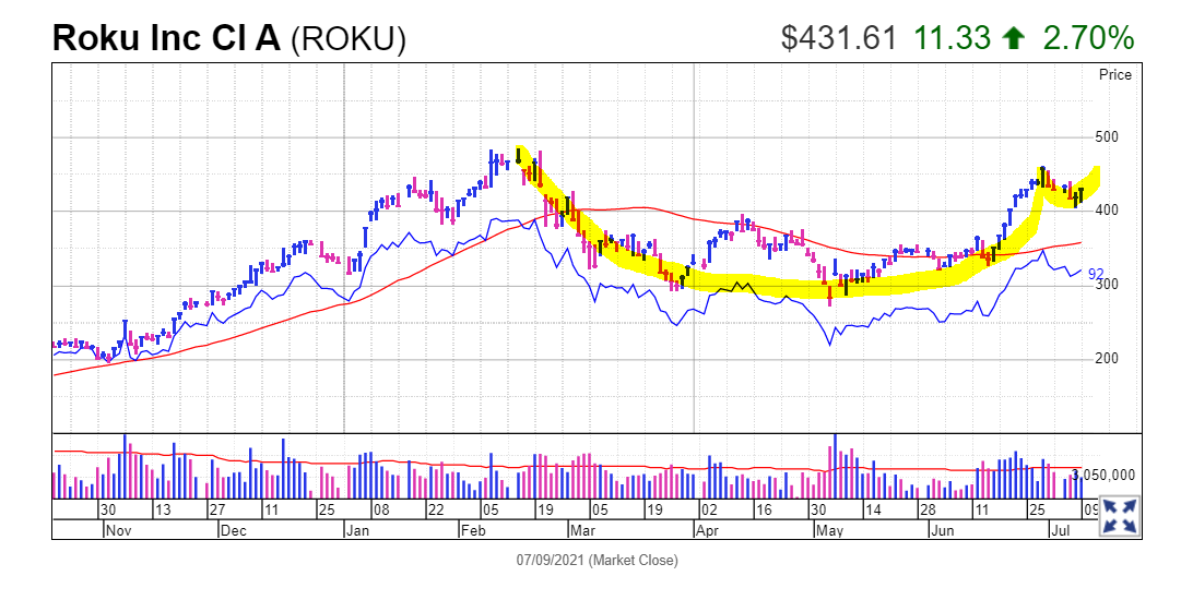 Sau phiên đảo chiều tăng giá ngày thứ năm, Roku (ROKU) tăng 2.7%.Cổ phiếu này đang thiết lập mẫu hình Chiếc Cốc-Tay Cầm. Cổ phiếu Upwork (UPWK), cũng tăng 4.5%.