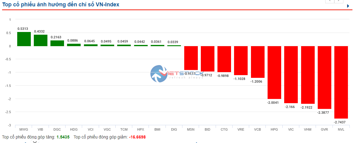 Chỉ số VN-Index giảm 2% với thanh khoản hôm nay đạt 713 triệu đơn vị, cao hơn so với phiên trước, đáp ứng tiêu chí ngày phân phối. Đầu phiên giao dịch, thị trường vẫn còn được dẫn dắt bởi một vài cổ phiếu dòng ngân hàng như TCB, TPB, VIB nhưng sau 10 giờ sáng thì mọi chuyện đã thay đổi 360 độ, nhiều cổ phiếu thuộc những nhóm ngành dẫn dắt trước đây như ngân hàng, thép, chứng khoán, dầu khí đồng loạt quay đầu giảm điểm khá mạnh, phá vỡ những mức hỗ trợ quan trọng. Tiêu biểu trong số đó không thể không nói đến cổ phiếu HPG – một Leader của dòng thép, cổ phiếu giảm -3.5% phá thủng MA50 ngày với thanh khoản lớn hơn khối lượng giao dịch bình quân 50 phiên. Các cổ phiếu giảm điểm nhiều nhất trong hôm nay ảnh hưởng đến chỉ số VN-Index đó là NVL (-6.6%), GVR (-6.9%), VHM (-2.2%), VIC (-2.2%), VCB (-1.1%),…..