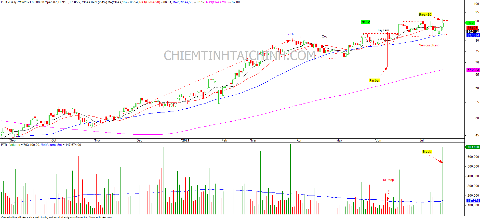 Trên đồ thị giá, ngày 19/7/2021, PTB có điểm mua Pocket Pivot của môn đệ ONeil. Liên hệ zalo 0977.697.420 của Team Nhà Đầu Tư Canslim để được tư vấn chi tiết.