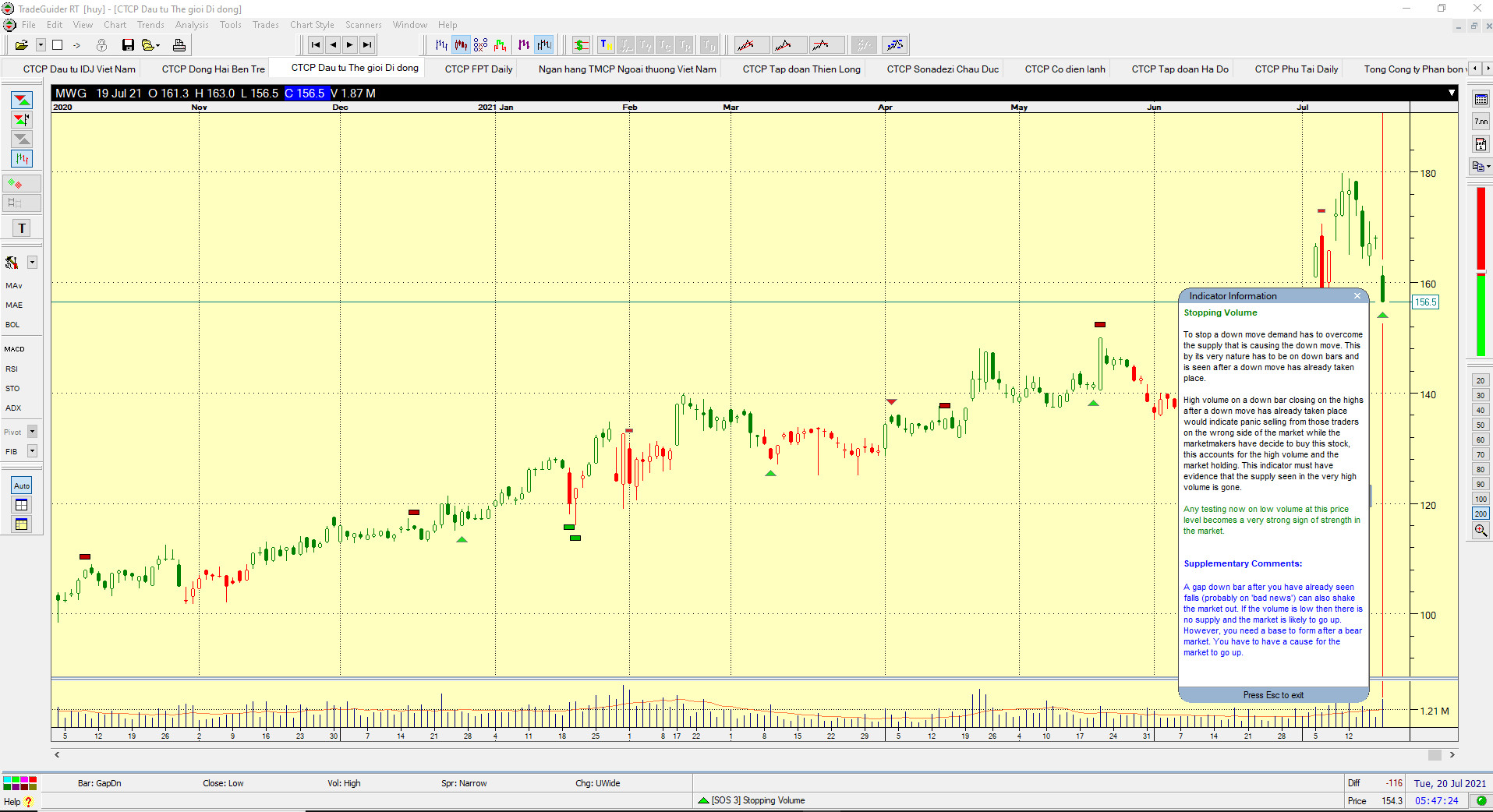 Trong phiên bán tháo ngày 19/7/2021, cổ phiếu MWG hình thành Stopping Volume theo ngôn ngữ VSA. Cổ phiếu này vẫn giữ được MA20 ngày. Nếu phiên tiếp theo MWG trở lại tăng giá và giữ được MA20 ngày, đó là cơ hội để tiếp tục bổ sung vị thế sau điểm mua breakout nền giá phẳng hồi đầu tháng. (Chi tiết liên hệ Team Nhà Đầu Tư CANSLIM qua zalo 0977.697.420)