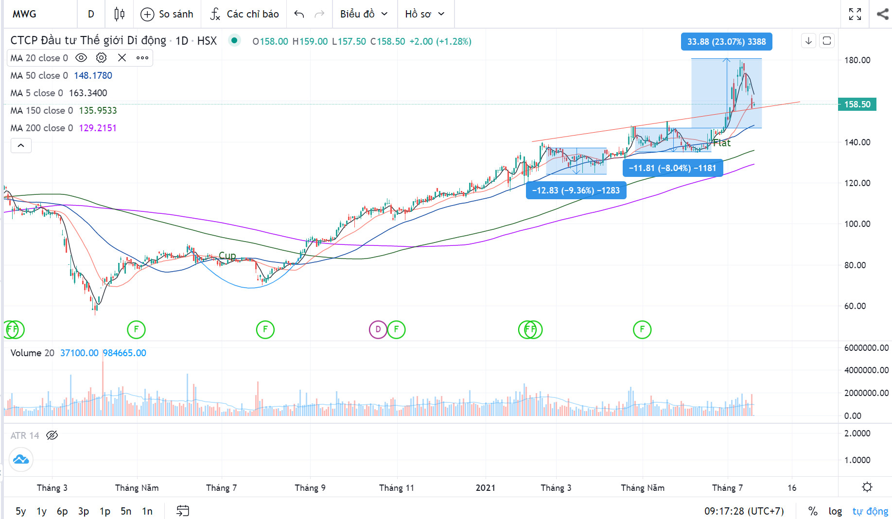 Vào đầu tháng 7.2021, cổ phiếu MWG lặng lẽ tạo điểm phá vỡ (breakout) từ hai nền giá phẳng (Flat Base) nằm chồng trên nhau. Đây là nền giá số 2. Cũng giống như nhiều cổ phiếu bán lẻ khác như MSN, FRT…MWG được kỳ vọng hưởng lợi từ giãn cách xã hội. Thế nhưng, làn sóng chỉ trích kêu gọi tẩy chay bắt đầu khi chuỗi Bách Hóa Xanh bán cao hơn giá niêm yết trong mùa dịch. Cơ quan chức năng đã tiến hành xử phạt ở nhiều tỉnh. Khách hàng tỏ ra bức xức. Trong phiên giao dịch ngày 19/7/2021, MWG giảm mạnh gần 7% về gần sát giá sàn 156,600, tương ứng giá trị vốn hóa mất đi 5,500 tỷ đồng.