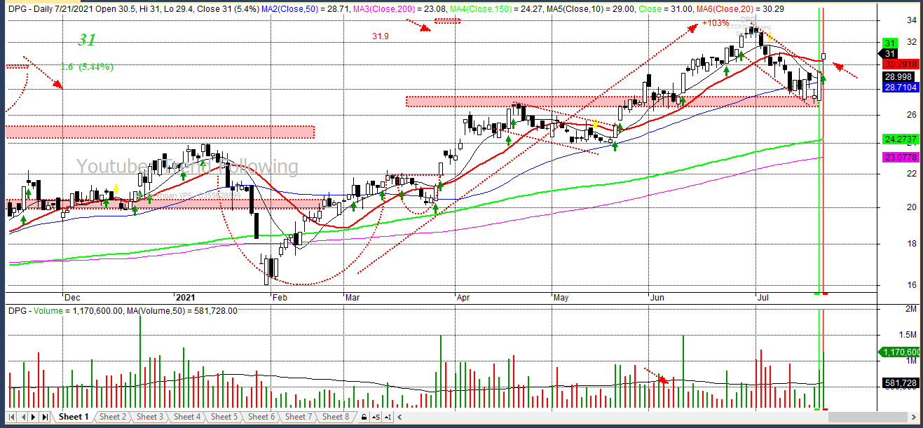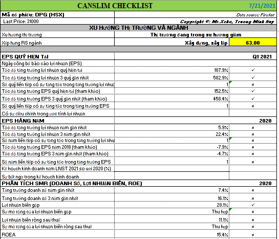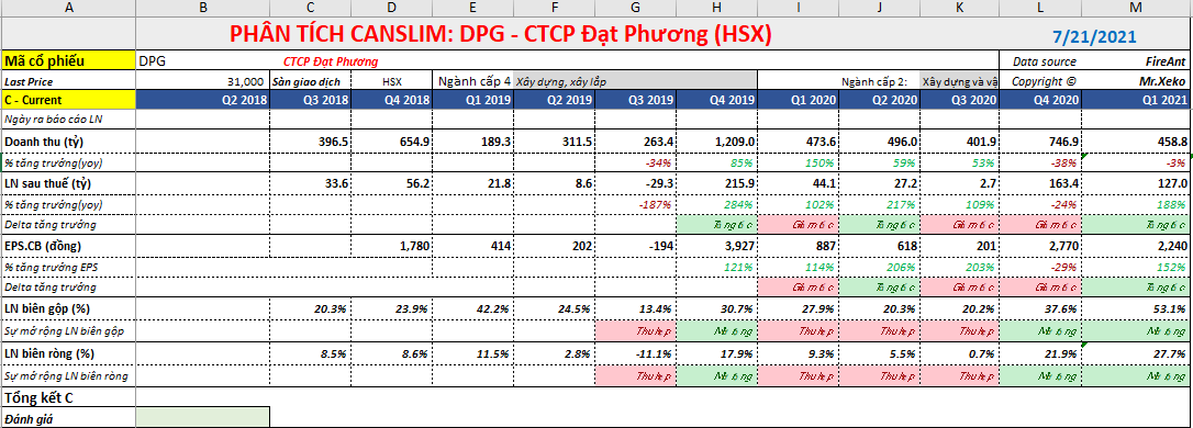 Theo mô hình giao dịch CANSLIM, cổ phiếu DPG đáp ứng tiêu chí chữ C trong CANSLIM khi có lợi nhuận sau thuế quý 2 đạt 104.5 tỷ đồng, tăng 284% so với quý 2/2020. Cụ thể, riêng quý 2 doanh thu thuần đạt 527 tỷ đồng, tăng 6% so với cùng kỳ, giá vốn hàng bán lại giảm nên lợi nhuận gộp đạt gần 176 tỷ đồng, tăng 74% so với quý 2/2020. Công ty cổ phần Đạt Phương giải trình cho việc lợi nhuận tăng cao là do trong quý 2/2021 lợi nhuận gộp mảng sản xuất điện và mảng đầu tư BĐS hơn cao, đồng thời công ty thực hiện hoàn nhập khoản dự phòng tổn thất đầu tư vào chi phí tài chính.