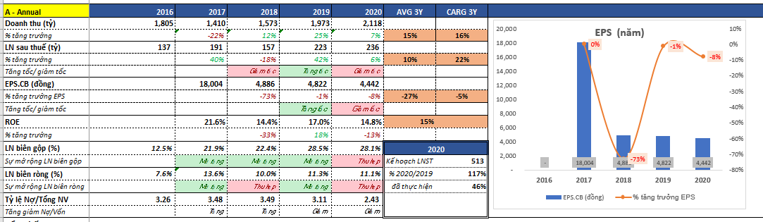 DPG không đáp ứng tiêu chí chữ A trong CANSLIM khi tổng lợi nhuận sau thuế năm 2020 chỉ đạt 236 tỷ, tăng 6% so với năm 2019.