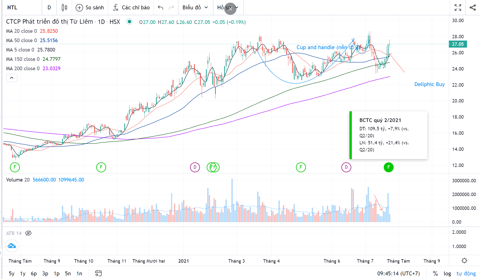 NTL đang xây lại điểm mua của mẫu hình Cup and handle, vốn là nền giá số 2. Điểm mua hiệ nay là Dellphic Buy. NTL đang có sự tăng tốc trong tăng trưởng lợi nhuận trong hai quý gần nhất lần lượt là +10% và +21%. Lưu ý, rủi ro thị trường là đang ở trong xu hướng giảm. Nhà đầu tư cần cân nhắc tỷ trọng giải ngân và cách quản trị rủi ro phù hợp trong bối cảnh giảm giá.