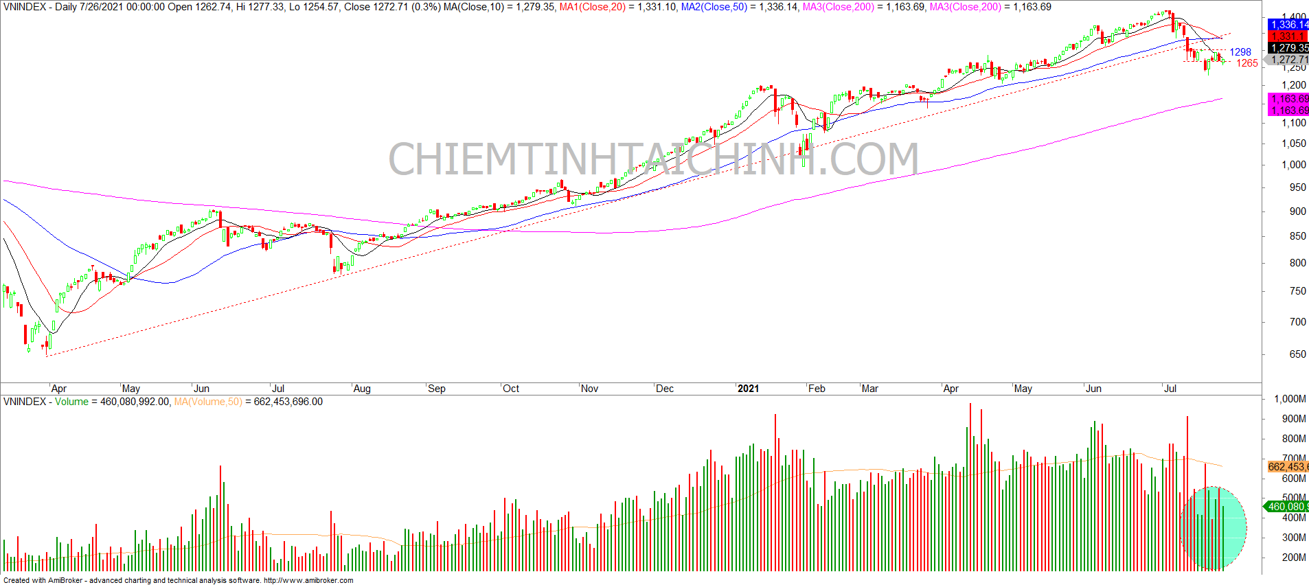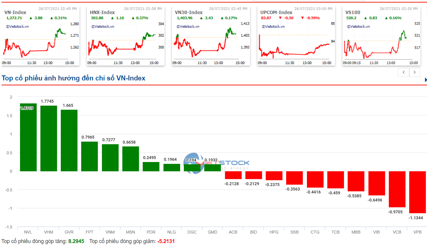 Kết thúc phiên giao dịch ngày 26/7/2021 chỉ số VNIndex đóng cửa ở mức 1,272.71 điểm, tăng 3.88 điểm tương ứng với mức tăng 0.31%. Thanh khoản của thị trường đạt mức hơn 460 triệu đơn vị, thị trường hồi phục khá ấn tượng trong khi phiên sáng giảm điểm xuống mức 1256 điểm. Nhóm ngành bất động sản, cảng biển và các cổ phiếu tăng trưởng đang là tâm điểm của thị trường như: NVL,VHM,FPT,VNM,MSN,… Trong khi nhóm ngân hàng, thép vẫn đang là tội đồ của thị trường với các cổ phiếu kéo giảm đà tăng của thị trường như: VPB,VCB,VIB,MBB,TCB,CTG….