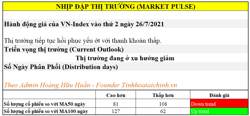 Quan sát 5 phiên nỗ lực hồi phục của thị trường, thì phiên giao dịch vào hôm thứ 6 ngày 23/7/2021 là một phiên nỗ lực hồi phục cần được xem xét một cách cẩn trọng vì độ biến động . Phiên hôm nay thị trường hồi phục yếu ớt, tuy nhiên vẫn giữ được mức 1268 điểm. Đây được xem là cơ hội mong manh cho đợt hồi phục này. Nhà đầu tư vẫn nên thận trọng và quản trị tỷ lệ giải ngân, điểm dừng lỗ để kiểm soát được rủi ro khi thị trường giảm điểm trở lại. Còn có ngày bùng nổ theo đà sẽ có nhiều cơ hội giải ngân.