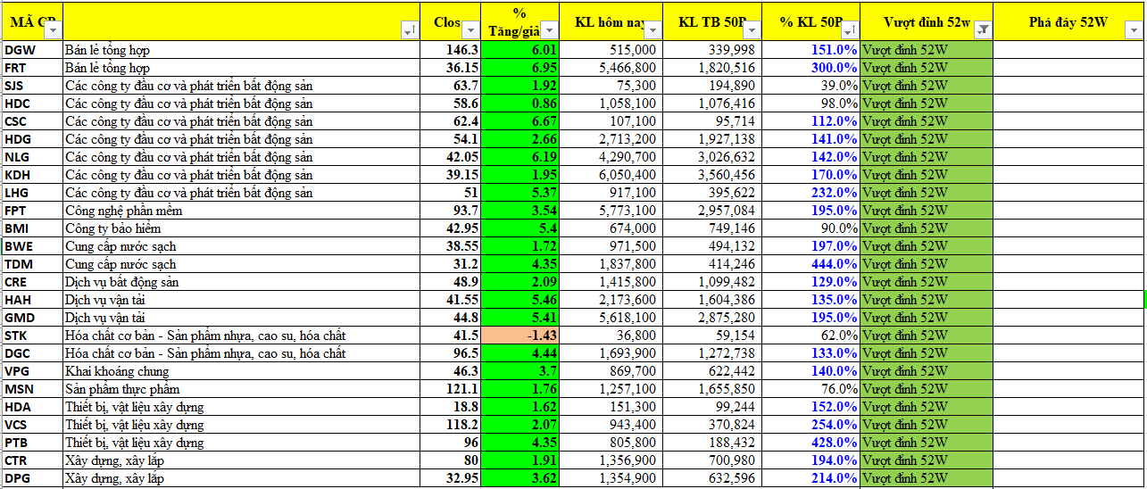 Danh sách các cổ phiếu vượt đỉnh 52 tuần sau phiên ngày 26/7/2021 đang có dấu hiệu mở rộng và tậm trung vào các nhóm ngành: Bất động sản, cảng biển – logistics, hóa chất, vật liệu xây dựng.