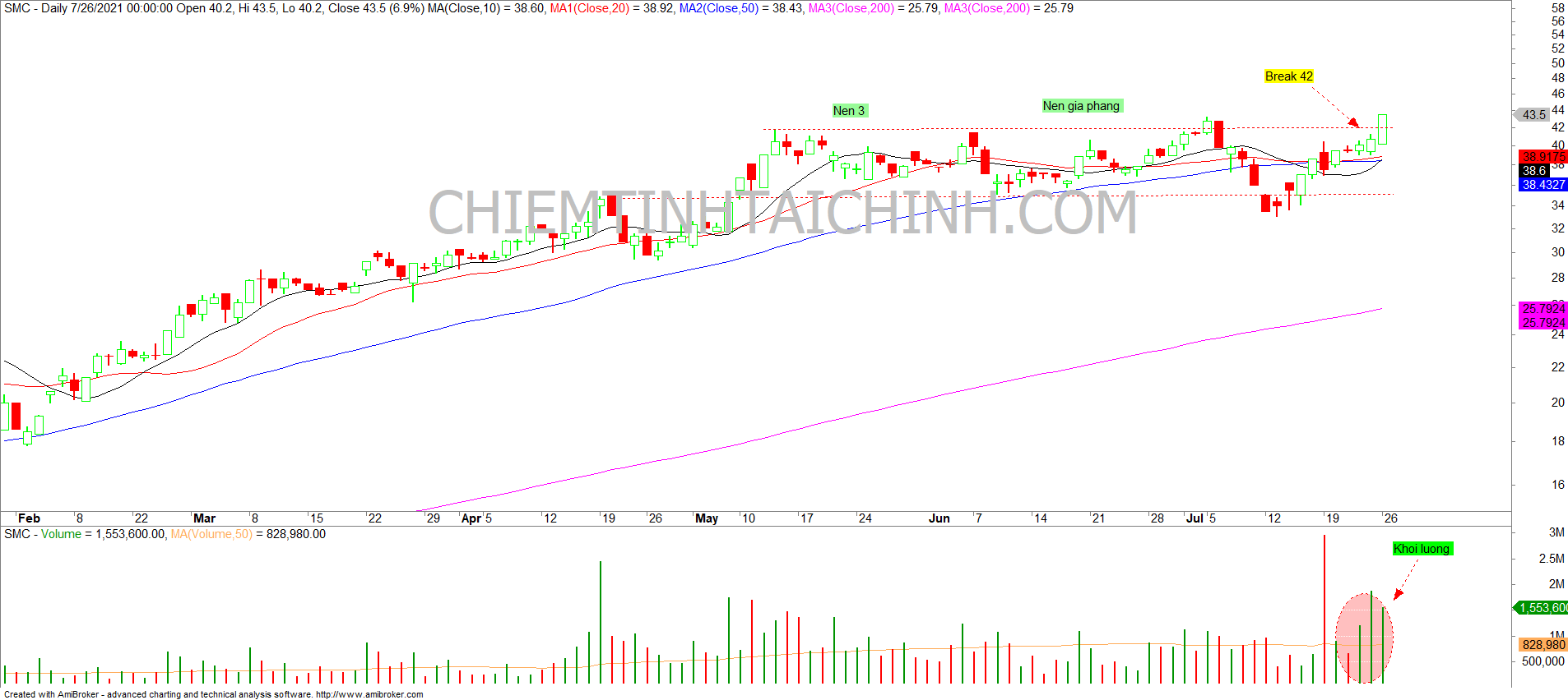 Trên đồ thị của SMC phiên hôm nay đã Break nền giá phẳng ở vùng 42. Thanh khoản 3 phiên gần đây cũng được cải thiện, điều này thấy rõ khối lượng vượt qua bình quân 50 phiên. Lưu ý SMC đang ở nền giá số 3, đây là điểm mua gia tăng đối với SMC.
