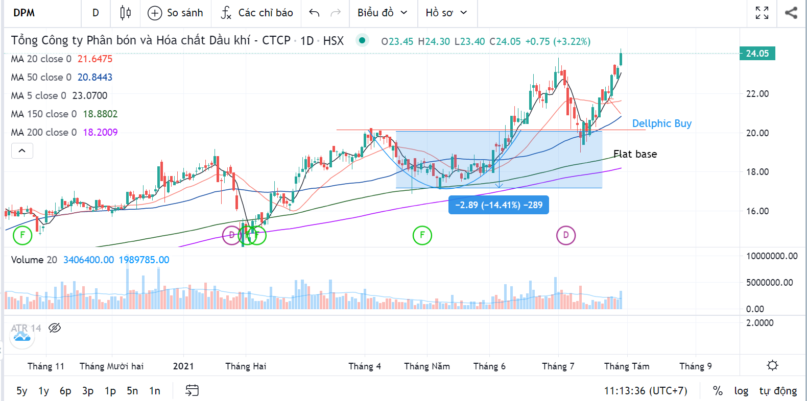 Ngành phân bón đang có sóng với sự tăng giá của DCM, DPM và LAS. Trên đồ thị, DPM có điểm mua Dellphic Buy trước khi công bố báo cáo tài chính quý 2.