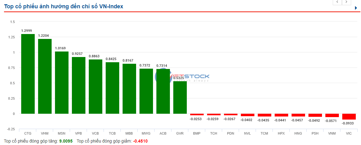 Chỉ số VN-Index hôm nay đóng cửa tăng 1.3% với thanh khoản hôm nay đạt 445 triệu đơn vị, cao hơn so với phiên trước. Thị trường cuối cùng cũng xuất hiện Ngày bùng nổ theo đà trong sự ngờ vực của nhiều nhà đầu tư. Thị trường hôm nay chính thức đóng cửa trên mức kháng cự 1286, tiến tới vùng kháng cự mới 1305. Nhóm ngành ngân hàng hôm nay tiếp tục trở thành cứu tinh cho toàn thị trường với mức hồi phục tăng giá trở lại mạnh mẽ, tiêu biểu với những cái tên rất đỗi quen thuộc như CTG (+3%), VPB (+2.5%), VCB (+0.9%), TCB (+1.8%), MBB (+2.9%), ACB (+3%),… Nhóm ngành bất động sản cũng hỗ trợ cho ngày tăng giá của thị trường với nỗ lực tăng giá của VHM (+1.3%), NLG (+1.4%), KDH (+2.7%),…