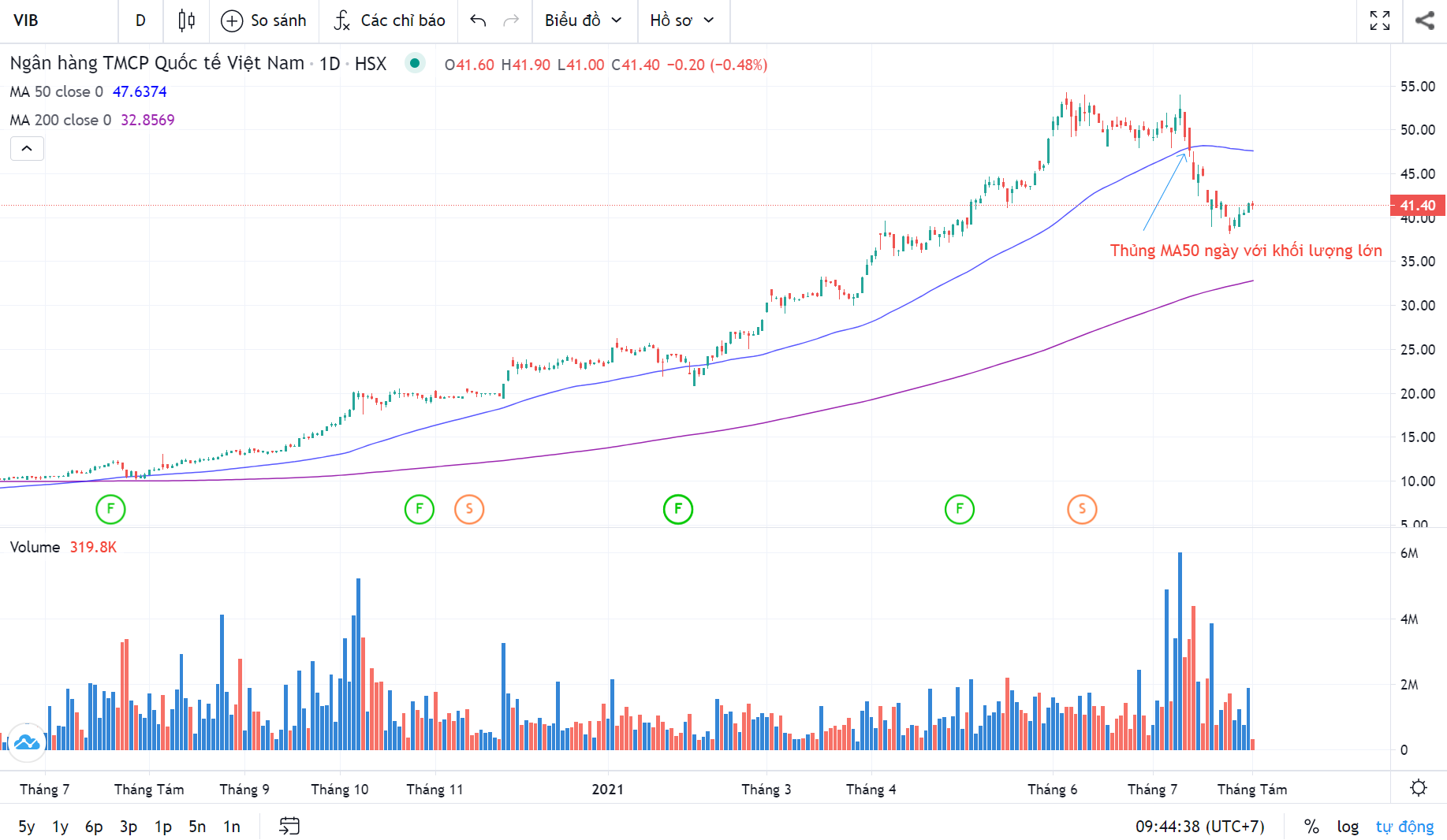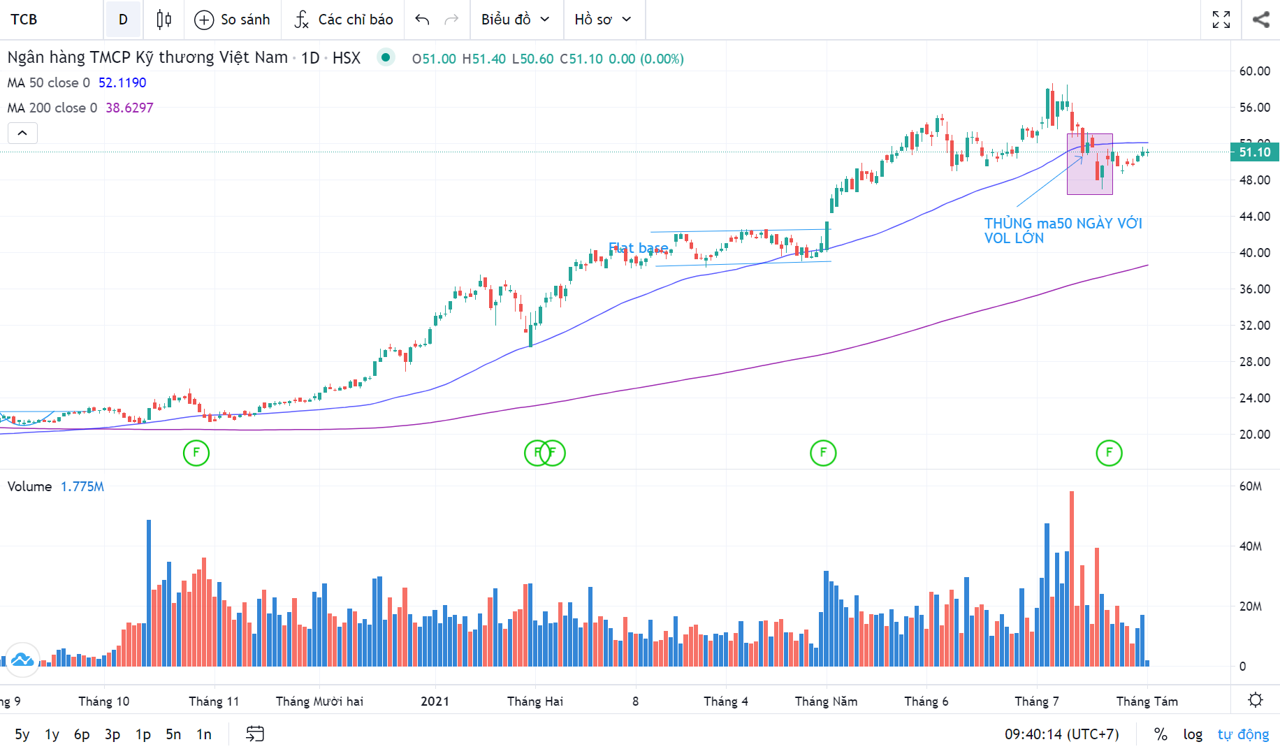 Tuy nhiên, TCB đang gãy xu hướng theo phương pháp đầu tư CANSLIM khi giá thủng MA50 ngày, lần đầu tiên kể từ chân sóng tháng 10 năm ngoái, đi kèm với khối lượng lớn. Đây là dấu hiệu chốt lãi theo phương pháp CANSLIM vì nó cho thấy dòng tiền thông minh đang rút khỏi TCB. Cổ phiếu TCB cũng đã có hai nền giá trước đó.