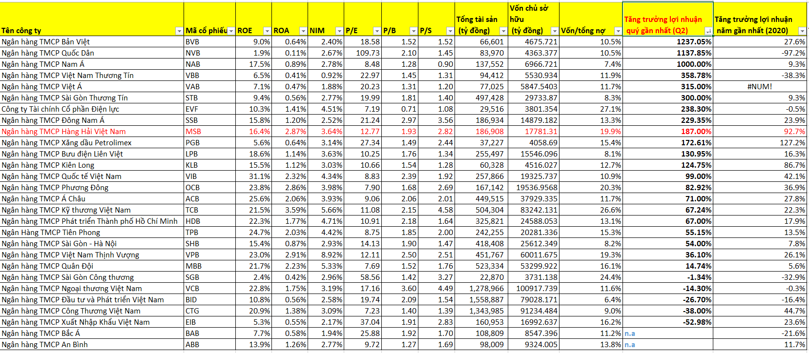 Các cổ phiếu ngân hàng nhỏ đang được chú ý vì mức độ tăng trưởng lợi nhuận cao trong các quý gần đây. Trong số các cổ phiếu có tốc đột tăng trưởng cao, MSB được chú ý với tốc độ tăng trưởng lợi nhuận quý 2 là 187%. Đây là quý thứ ba liên tiếp cổ phiếu ngân hàng này duy trì tốc độ tăng trưởng ba con số. So với các bank khác có lợi nhuận tăng trưởng nhanh trong quý 2, thì MSB có P/E thấp hơn, nhưng hệ số NIM, ROE cao hơn. Tốc độ tăng trưởng lợi nhuận năm 2020 cũng tốt hơn. MSB lần đầu tiên lọt vào Top 10 ngân hàng có lợi nhuận lớn nhất, tính theo giá trị tuyệt đối, cho dù đây là ngân hàng có quy mô tài sản nhỏ.