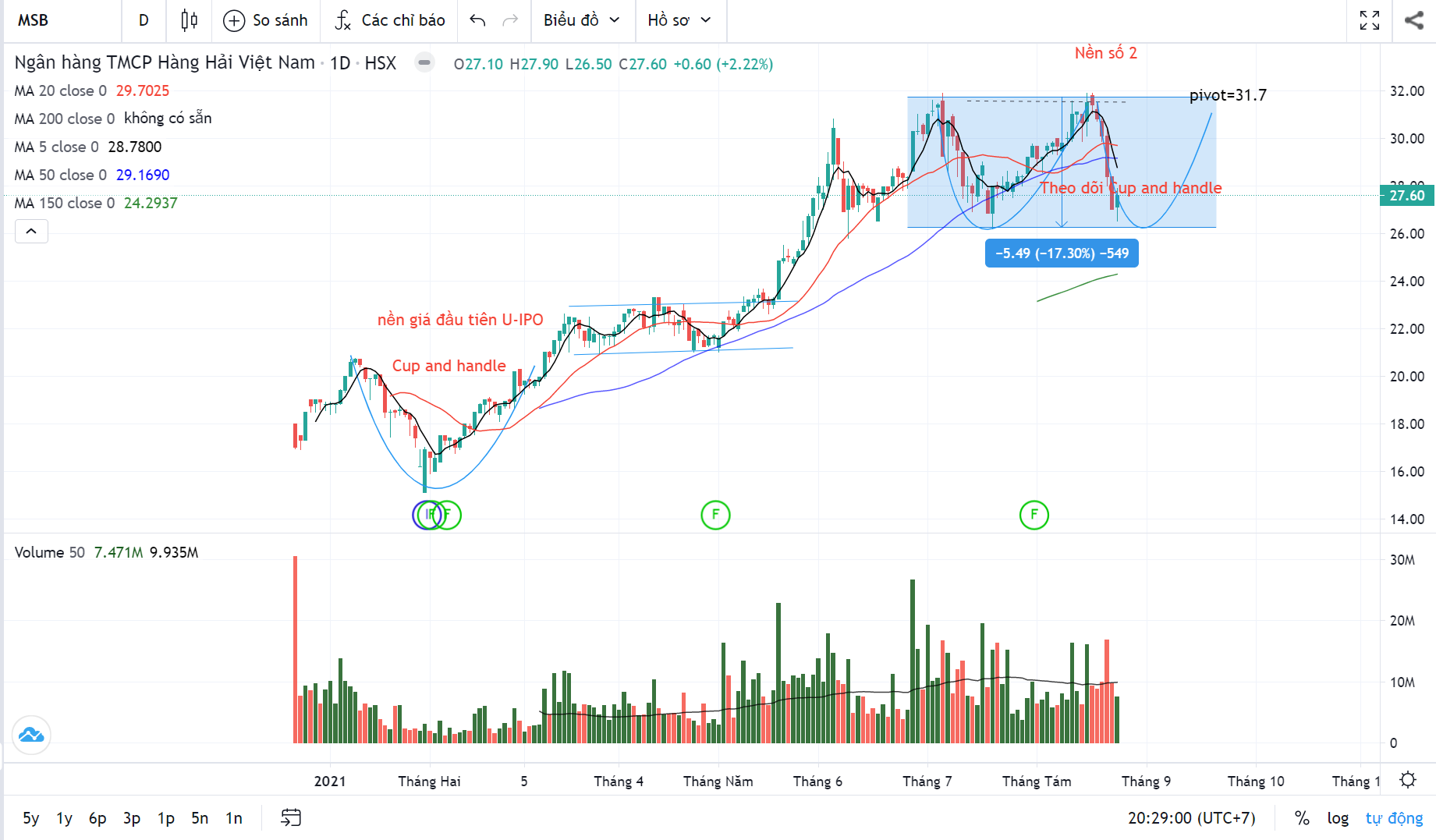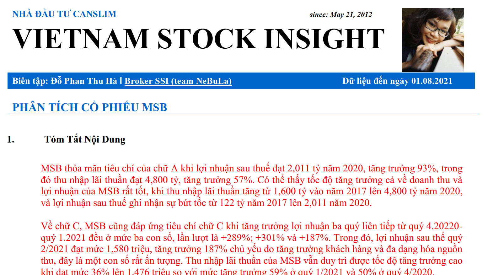 Cổ phiếu MSB có mẫu hình U-IPO khi mới niêm yết và hiện đang là một trong các cổ phiếu hiếm hoi của ngành ngân hàng giữ được MA50 ngày. Team Nhà Đầu Tư CANSLIM (Liên hệ zalo 0977.697.420) đã có những đánh giá chi tiết về cổ phiếu này trong bản báo cáo Vietnam Stock Insight. Quý nhà đầu tư có thể liên hệ để biết thêm chi tiết.