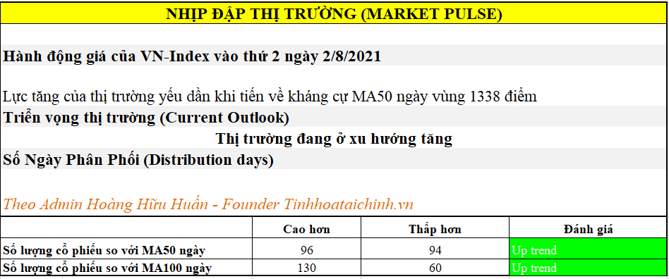 Chỉ số VNIndex đang tiến gần vùng MA50 ngày tương ứng vùng 1,338 điểm. Thị trường đang trong thời gian xác nhận ngày bùng nổ theo đà ngày 29/7/2021 có thành công hay không, lưu ý xác suất có 1/3 ngày bùng nổ theo đà không thành công tương ứng với 33%. Quan sát kỹ hơn thì ngày 30/7/2021 thị trường có thêm 1 ngày bùng nổ theo đa tiếp diễn sau ngày 29/7/2021 điều này đang củng cố xu hướng tăng của thị trường. Nếu những phiên sắp tới thị trường có phiên giảm trên 1% đi kèm với khối lượng lớn thì ngày bùng nổ theo đã dễ bị thất bại. Đồng thời phiên giao dịch ngày mai ngày 3/8/2021 cũng là phiên lượng hàng mua ở phiên bùng nổ theo đà về tài khoản.