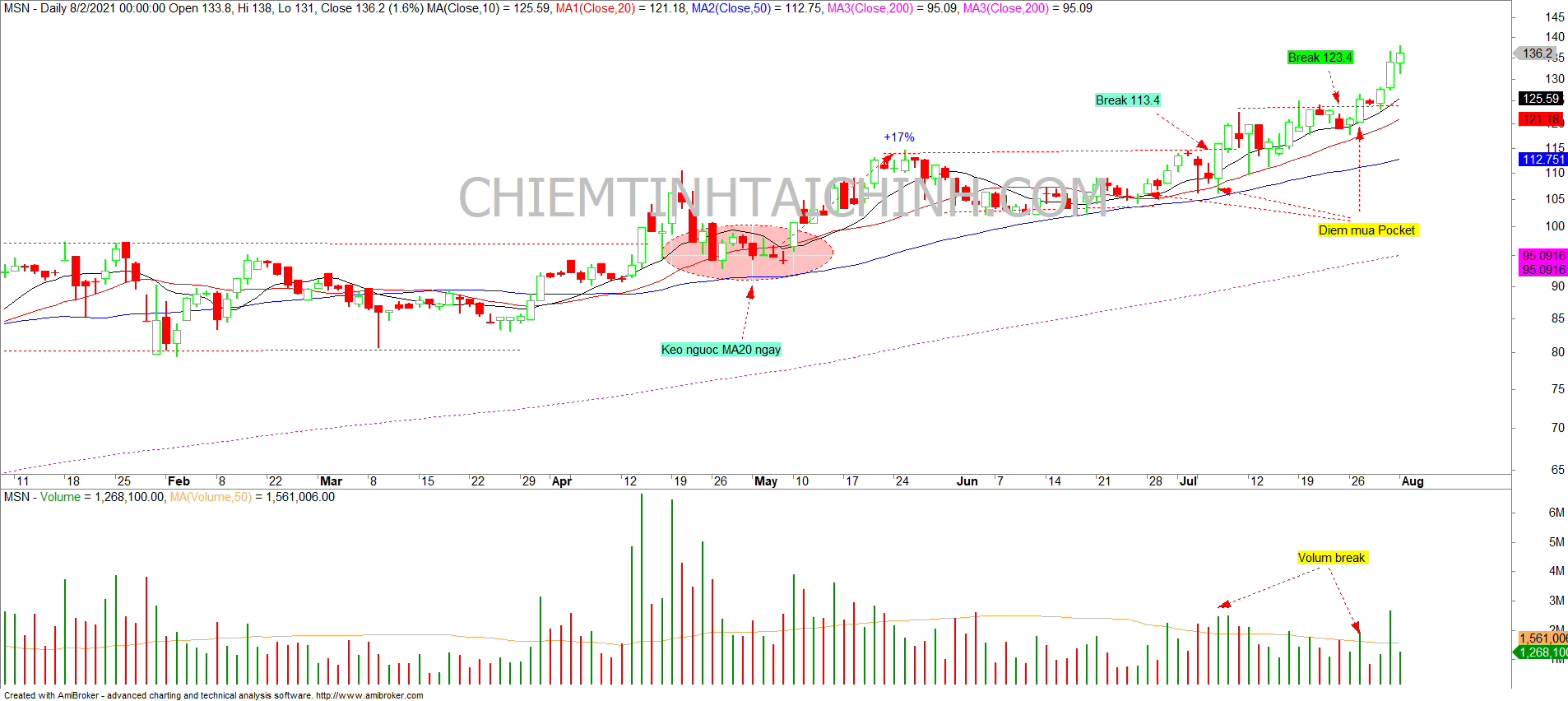 Cổ phiếu tiếp tục thiết lập đỉnh giá mới lên vùng 138.2 cổ phiếu đã tăng gần 20 % từ điểm pivot. Nhà đầu tư có thể chiến lược chốt lãi MSN trong thời gian sắp tới. Hoặc có thể dùng MA10 ngày để làm điểm dừng lỗ đối với MSN.