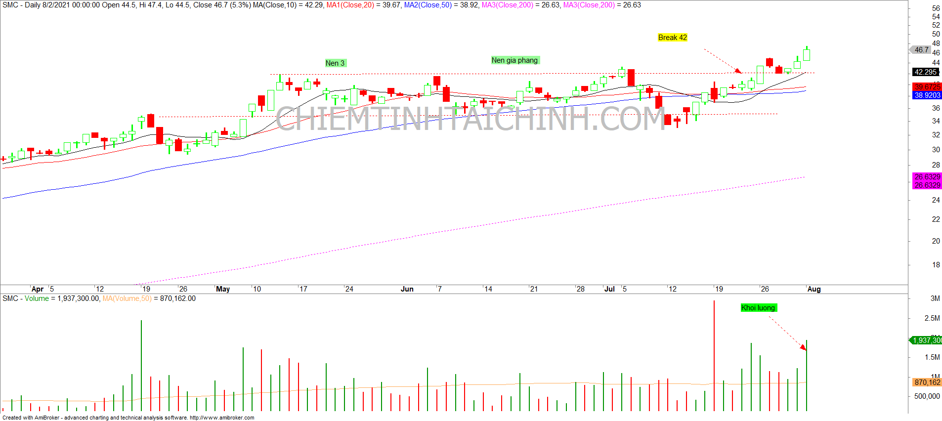 Ngày 26/7/2021 SMC đã break nền giá phẳng thắt chặt ở vùng 42.1 và đã có 3 phiên kéo ngược về vùng quanh 42-43. Và sau đó bật tăng trở lại vùng 45 .Đây là vùng mua theo điểm mua kéo ngược dưới vùng 45. Lưu ý tính từ điểm pivot vùng 42.1 với mức giá hiện tại là 46.7 thì cổ phiếu đã vượt quá 5% so với điểm mua.