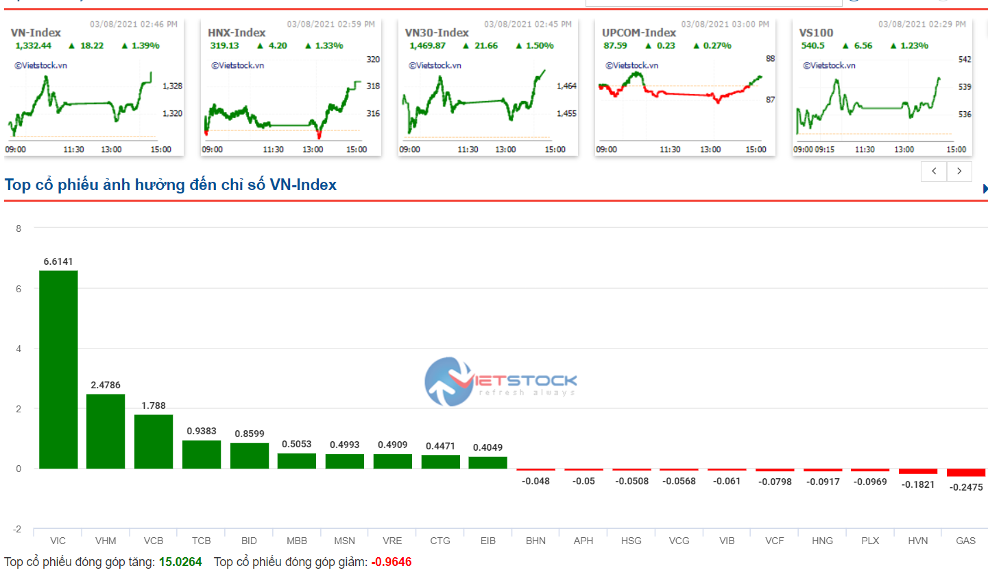 Kết thúc phiên giao dịch ngày 3/8/2021 chỉ số VNIndex đóng cửa ở mức 1,332.44 điểm, tăng 18.22 điểm tương ứng tăng 1.39%. Thanh khoản thị trường đạt hơn 617 triệu cổ và cao hơn phiên ngày 2/8/2021. Thị trường tiếp tục tăng điểm phiên thứ 5 liên tiếp, phiên hôm nay thị trường tăng điểm được cổ phiếu VIC kéo tăng hơn 6.6 điểm chiếm gần 30% đà tăng điểm hôm nay. Thêm vào đó là các cổ phiếu như: VHM,MSN,VCB,TCB,BID,MBB,VRE,CTG…. cũng đóng góp vào đà tăng của thị trường. Ở chiều nhóm cổ phiếu giảm thì đa số các cổ phiếu không tác động nhiều đến chỉ số VNIndex.