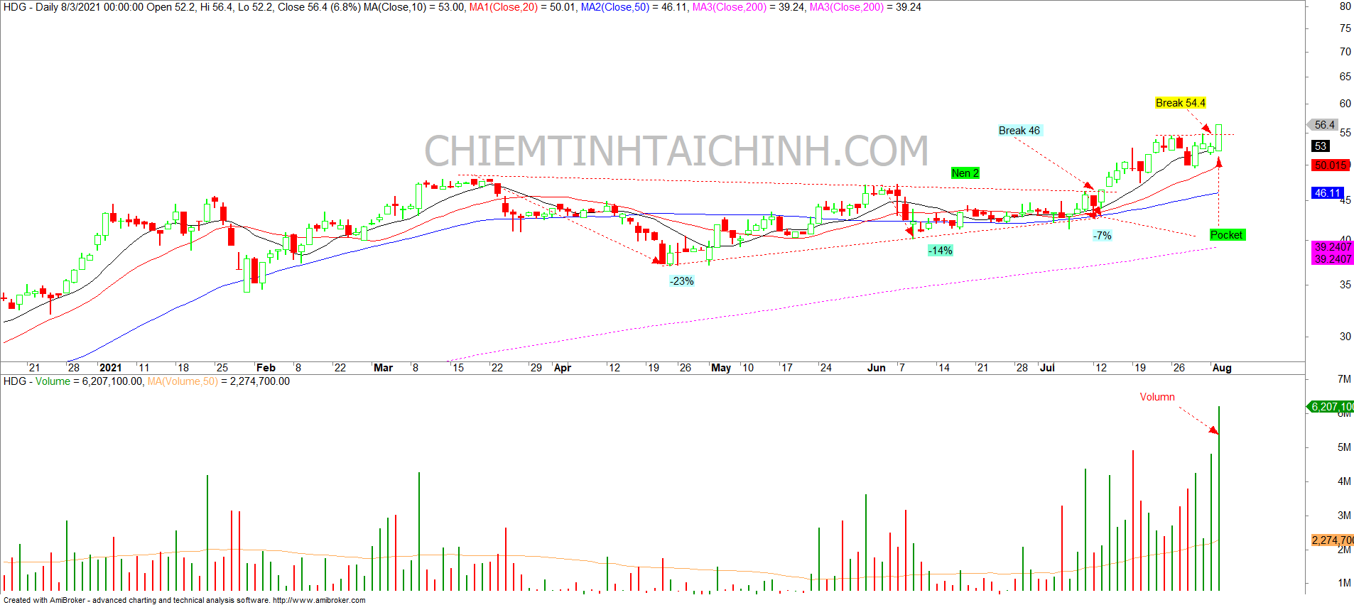Cổ phiếu HDG phiên hôm nay tiếp tục cho điểm mua tiếp diễn Pocket khi cổ phiếu bật tăng trở lại MA10 ngày với khối lượng tăng mạnh. Đây cũng là điểm mua gia tăng đối với HDG, ngoài ra nhóm ngành bất động có sóng ngành đã giúp cổ phiếu HDG có 70% tiếp tục tăng điểm, chưa kể đến yếu tố nội tai jcuar doanh nghiệp.