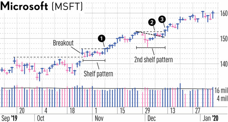 Vòa ngày 28 tháng 10, cổ phiếu công nghệ khổng lồ này có điểm pahs vỡ từ Nền Giá Phẳng Hẹp với điểm mua 142.43.  Theo sau nó là một khoảng trống tăng giá (gap up), nó hình thành cái kệ trong 8 ngày. Nó chỉ có độ sâu 2%. Mr.Softy (tên gọi riêng của Microsoft sau đó có điểm phá vỡ rời khỏi cái kệ vào ngày 8 tháng 11, cho phép bạn bổ sung vị thế lần đầu tiên (điểm số 1). Nó đã tăng đến 142.50 vào ngày 27 tháng 11 và sau đó thiết lập một cái kệ thứ hai trong 9 ngày, với độ sâu 3.8%. Đây là một điểm phá thủng xuống dưới EMA21 ngày- một điều rất phổ biến.