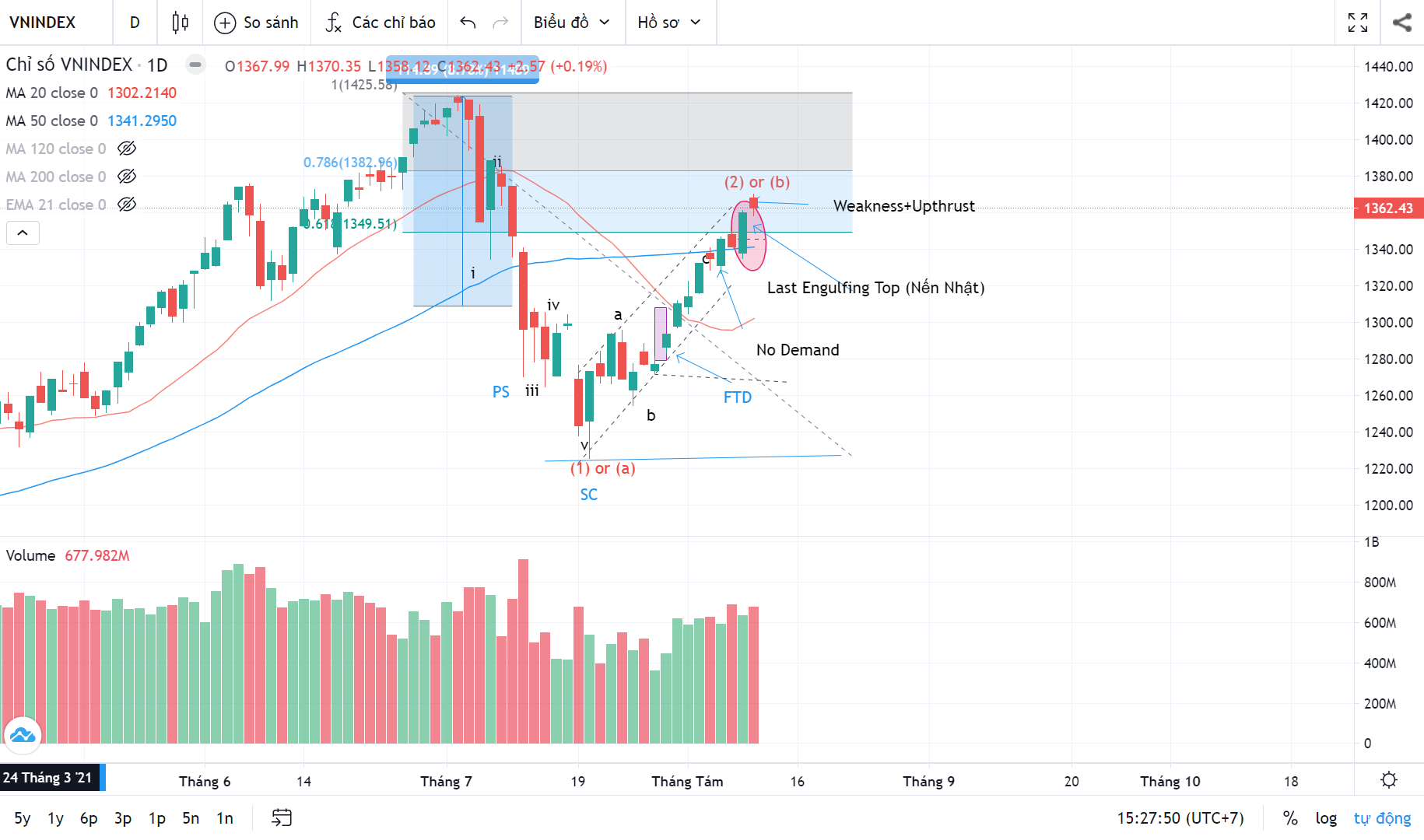 Hành động giá của VN-Index là dao động trong biên độ (spread hẹp), và đóng cửa rời xa đỉnh cao nhất ngày, Đây là dấu hiệu yếu xuất hiện (weakness+ Upthrust). Khối lượng cao hơn phiên trước thể hiện áp lực bán. Các nhà đầu tư đang tranh thủ chốt lời ở một số cổ phiếu midcap, trong khi các trụ cột vốn hóa lớn đang bị cản tại các ngưỡng quan trọng. Ví dụ như HPG, TCB, NVL bị giảm tại MA50 ngày. VHM, GVR giảm khi quay trở lại đỉnh giá hồi tháng 7.