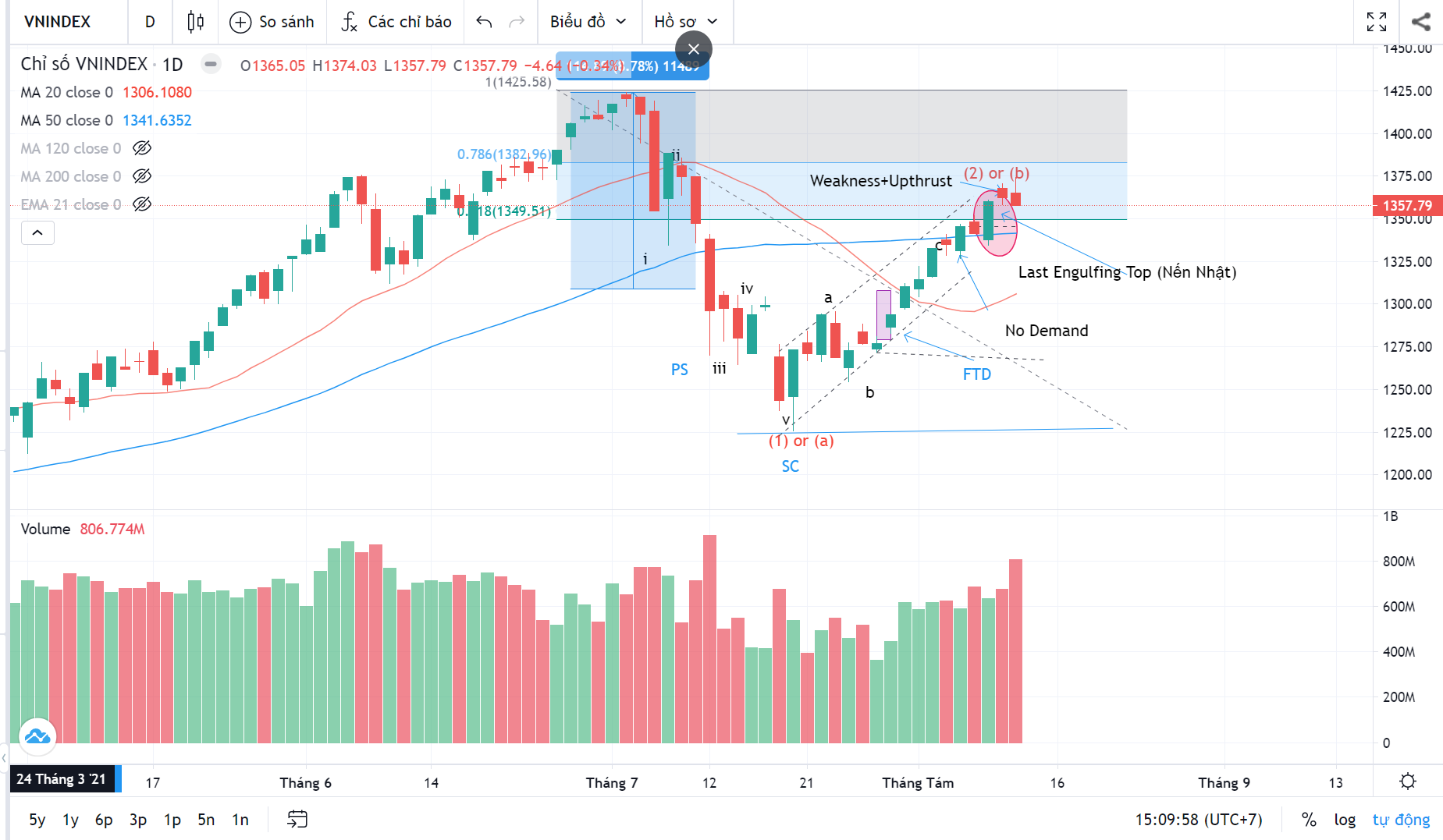 Sự giảm giá ngày hôm nay đã cho thấy áp lực từ thanh giá Weakness+Upthrust của phiên ngày hôm qua. Đường MA50 ngày trở thành mốc hỗ trợ quan trọng. Chúng tôi vẫn giữ thị trường ở xu hướng tăng nhưng sẵn sàng chuyển sang trạng thái đèn đỏ nếu như mốc MA50 ngày bị đánh mất.