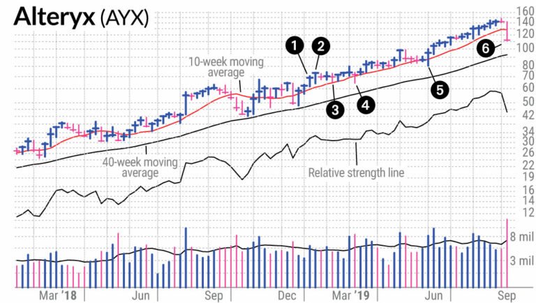 Bạn có thể chấp nhận mức rủi ro lớn hơn nếu mua tại đỉnh 5% của vùng mua hợp lý. Bạn có thể vẫn sống sót nếu chứ có cú giảm để kiểm tra tại mức 65.34 trong tháng 2 (điểm số 3). Nhưng mức dừng lỗ -8% có thể hạ gục bạn tại đầu tháng ba (điểm số 4). Nếu bạn sử dụng một mức dừng lỗ rộng hơn tại 60.88, mức dừng lỗ của bạn sẽ không bị chạm tới. Và mặc dù cổ phiếu Alteryx giảm xuống dưới MA10 tuần, nếu bạn đã chờ cho đến giá đóng cửa tuần, nó nhận được sự hỗ trợ và bật tăng trở lại.