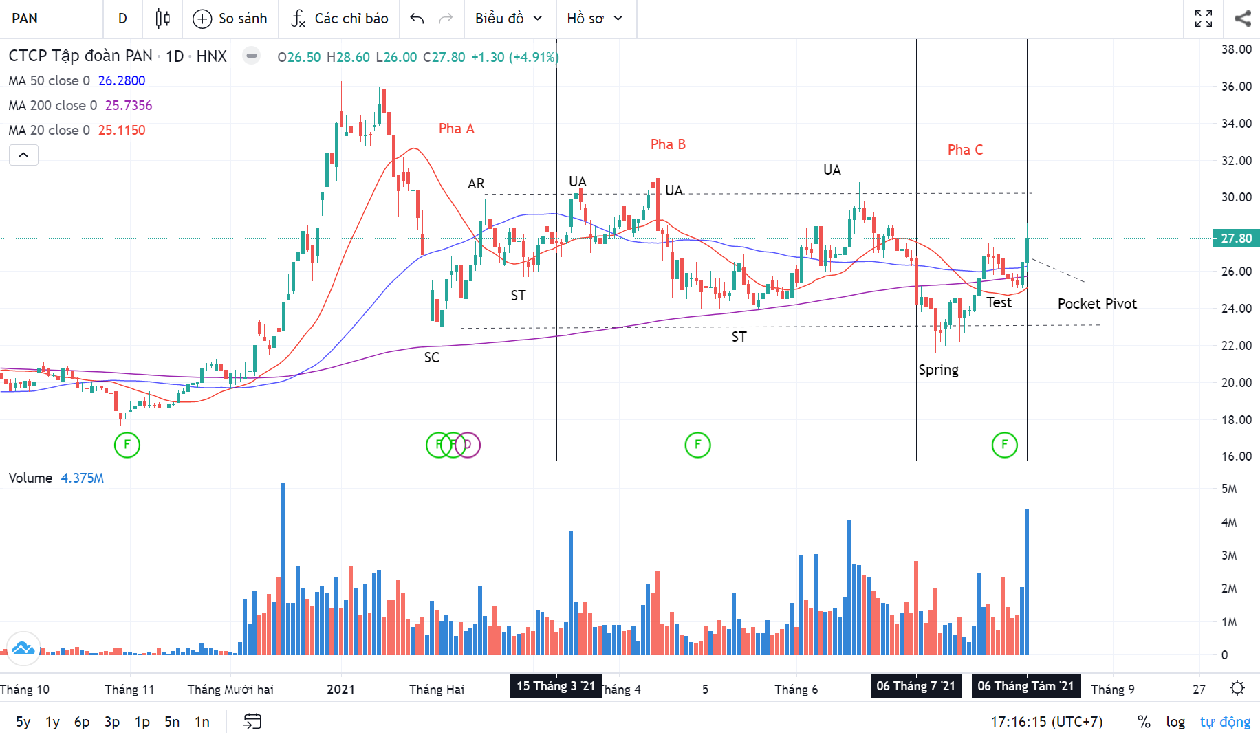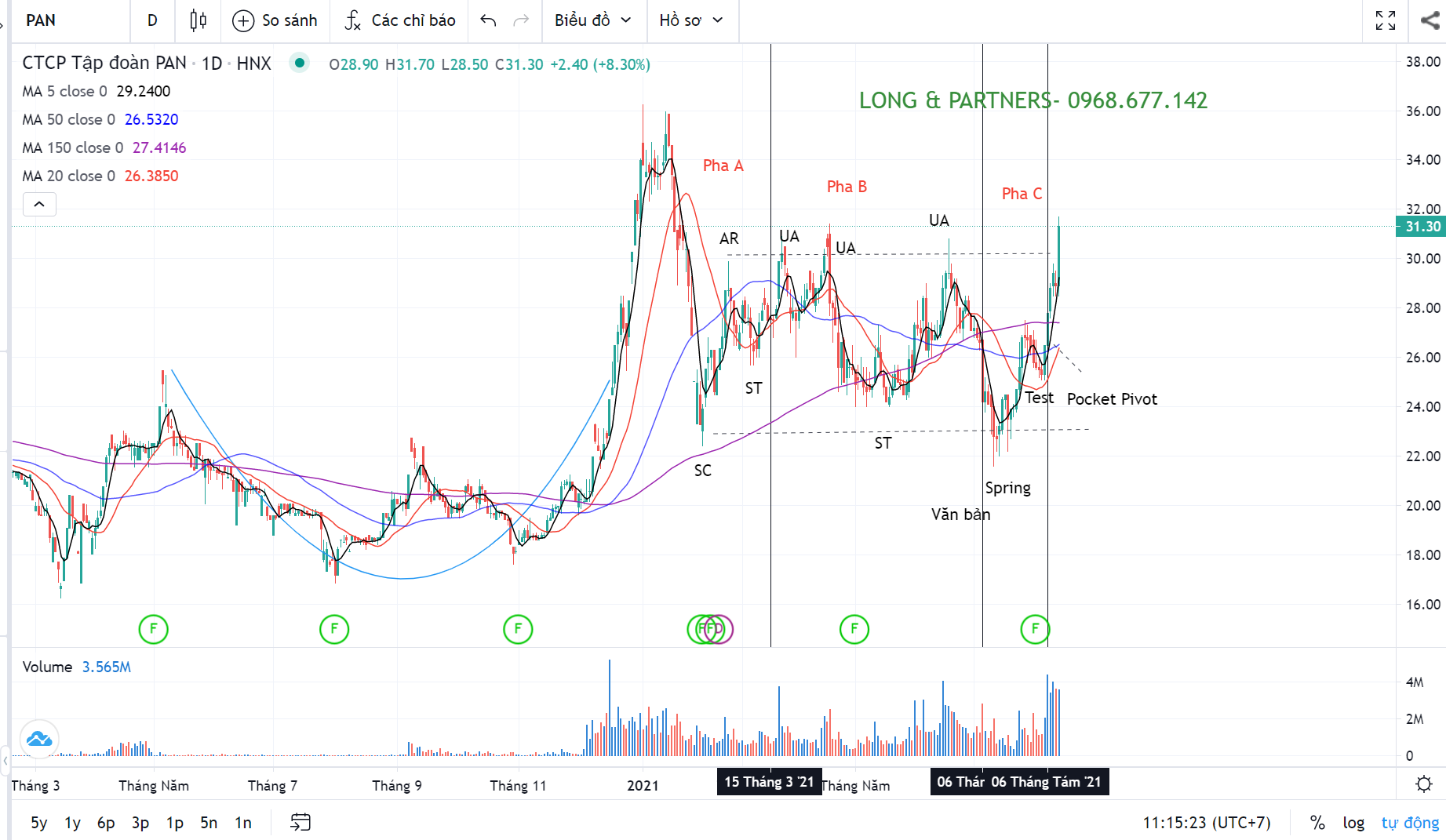 Cổ phiếu PAN xuất hiện tín hiệu mua Pocket Pivot trong phiên ngày hôm nay. Cấu trúc Wyckoff cho thấy cổ phiếu này đang hình thành cấu trúc tái tích lũy và đang ở pha C. Sau sự kiện Test thành công và bật tăng bằng Pocket Pivot, PAN có thể chuyển sang giai đoạn tăng giá ở pha D. Mẫu hình theo dõi là CUP LỚN với điểm pivot=31.28.