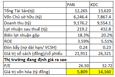 Tất nhiên, sự so sánh này là khập khiểng vì PAN thuộc về mảng nông nghiệp và thực phẩm trong khi KDC là về mảng dầu ăn, kem. Nhưng cả hai đều ở trong lĩnh vực thực phẩm tiêu dùng (cũng có chung mảng bán kẹo) và có những sự tương đồng nhất định về quy mô tài chính. Cụ thể, quy mô tài sản tầm 12-13 nghìn tỷ đồng, vốn chủ sở hữu tầm 6-8 nghìn tỷ đồng, doanh số tầm 9 nghìn tỷ đồng, lợi nhuận sau thuế tầm 200-400 tỷ đồng mỗi năm. Do đó, quy mô đòn bẩy tài chính cũng gần giống nhau, với nợ dài hạn bằng 23% vốn chủ sở hữu. Cả hai công ty đều có ROE thấp chỉ tầm 4%-5%, biên lợi nhuận gộp cũng tầm 18%-20%. Giá trị sổ sách cũng tầm 22,000-26,000. KDC có thể nhỉnh hơn một chút so với PAN ở các chỉ tiêu.