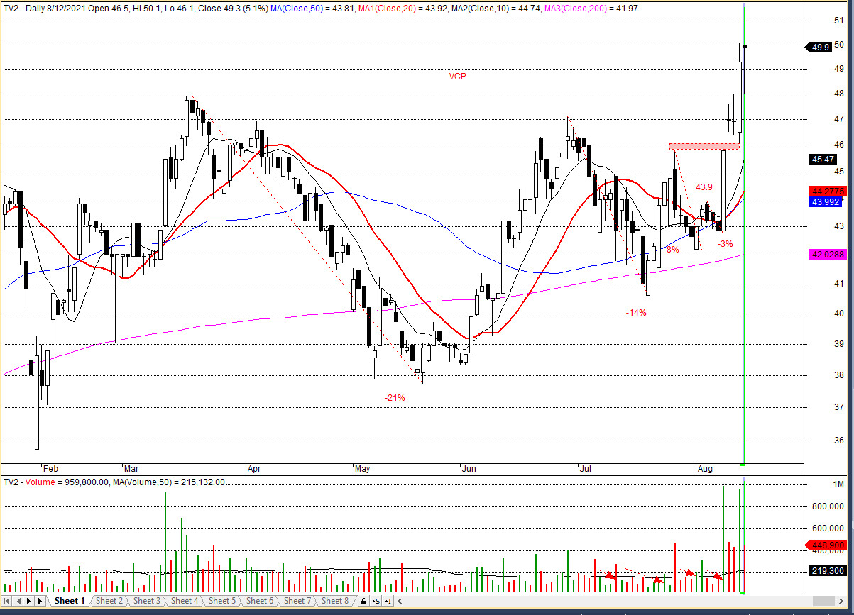 Cổ phiếu TV2 sau khuyến nghị của chúng tôi ở các bản tin trước tiếp tục tăng giá mạnh mẽ. Cổ phiếu trong phiên giao dịch đã có những biến động giá khó lường khiến nhiều nhà đầu tư lo sợ và có thể đã chốt non ở cổ phiếu này. Tuy nhiên, các biến động trong khung giá ngày có thể chỉ là nhiễu loạn, nhà đầu tư nên tránh việc bám bảng điện quá nhiều và tuân thủ các kỷ luật giao dịch đã đặt ra. Hiện tại, chúng tôi đang có +12% lợi nhuận từ điểm mua breakout mẫu hình VCP và tiếp tục nắm giữ đối với cổ phiếu này.